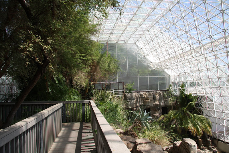 Unser Weg zum Petrified Forest NP brachte uns an einem weiteren Amerikanischen Hightlight vorbei, der Biosphere 2. In diesem Glaskomplexfand 1991-1993 ein interessantes Experiment statt: War es möglich, ein komplexes, luftdicht von der Umwelt abgeschlossenes Ökosystems herzustellen und darin 2 Jahre zu leben? Durch die vielen enthaltenen Vegetationszonen sollte dann sichergestellt werden, dass die Bewohner immer genug Sauerstoff (Pflanzen) und Nahrung (Pflanzen, Farm und Tiere) zur Verfügung hatten.