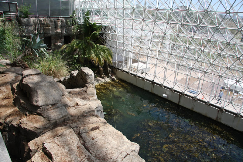 Biosphere 2 ist nun ein Forschungsort und wird von der University of Arizona verwaltet und genutzt. Die ehemals komplett von der Aussenwelt abgeschnittenen Hallen können nun auch von Innen besucht werden. Wir hatten Glück und erwischten gerade noch die nächste Tour durch die Hällen der Biosphere 2. Unsere Gruppe bestand nur aus 7 Personen und so hatten wir praktisch eine Privatführung. Nachdem wir uns beim Aufenthaltsraum in der Biosphere 2 versammelt hatten gings los durch die erste Türe in eine Halle mit Ozean, der Savanne und dem Mangrovensumpf. Der Ozean beherbergte früher auch Korallen, doch diese sind durch das letzte Experiment leider gestorben. Untersucht wurde die Auswirkung eines erhöhten CO2 Wertes im Meerwasser auf die Korallenpopulation, mit diesem traurigen Ergebnis. Unser Guide meinte dann auch etwas betrübt: „Wenn wir so weitermachen, sind alle Korallenriffe in 50 Jahren tot.“ Auch zum Mangrovensumpf hatte er eine Geschichte aus der Realität bereit: „Früher wären die Küsten rund um Florida und Golf von Mexico mit diesen Mangroven besiedelt gewesen. Dies war ein optimaler Schutz gegen die Huricans, doch seit die Menschen lieber direkt am Meer wohnen ist dieser Schutz nun weg und so sterben immer wieder Menschen in den Überschwemmungen“.
