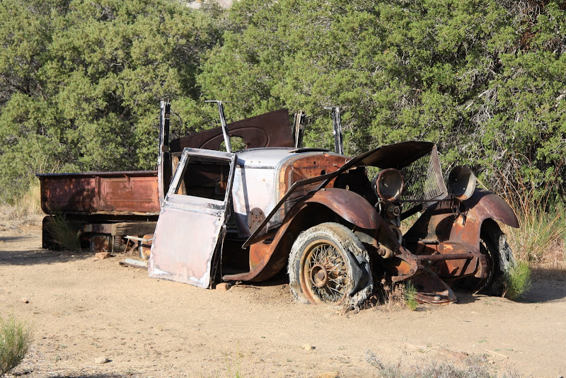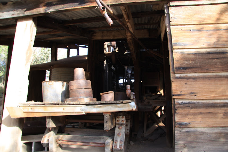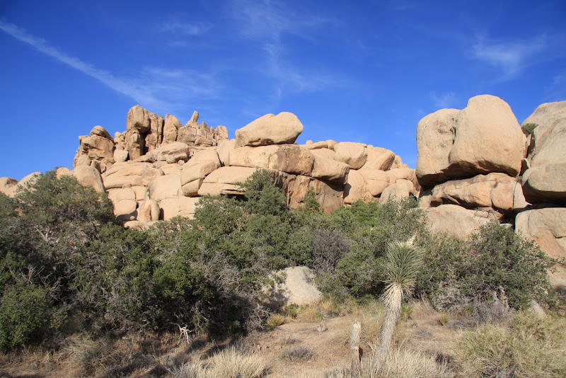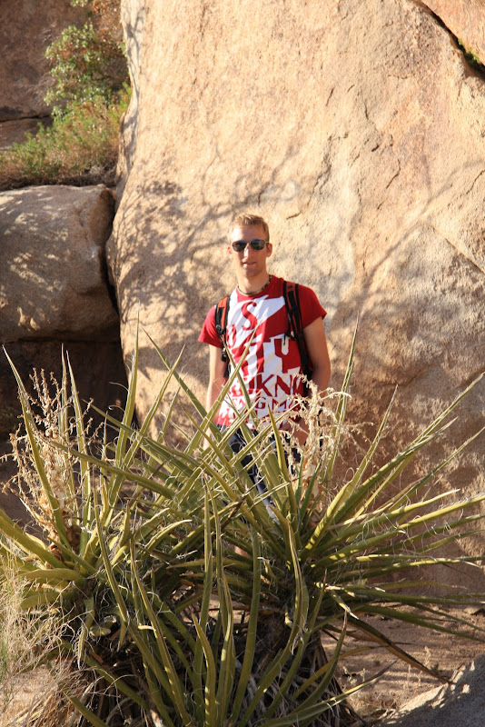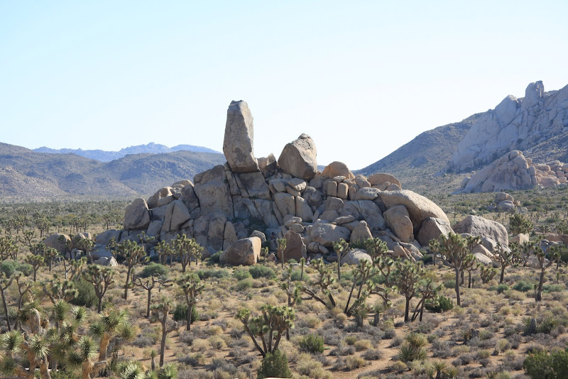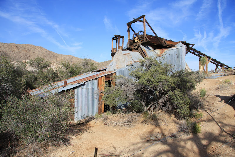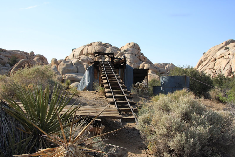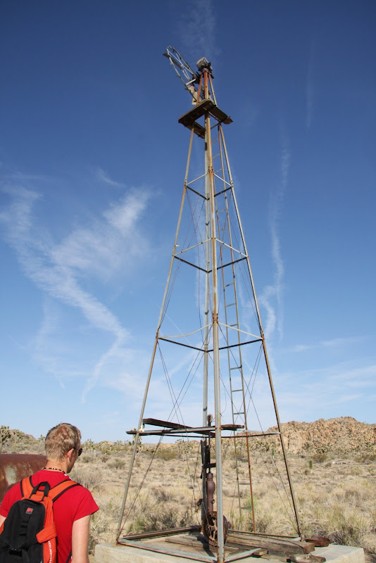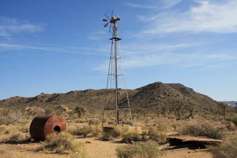 Nun war es schon 4 Uhr, uns es galt, in den verbleibenden Stunden bis zum Sonnenuntergang möglichst viel vom Park zu entdecken. So fuhren wir zum Baker Dam Parkplatz, von dort aus kann man zwei kurze Hikes durch die spezielle Landschaft machen. Zuerst ging’s zur „Wall Street Mill“: Durch die spezielle Felslandschaft und unzähligen Joshua Trees (eigentlich Kakteen) erreichten wir zuerst einen alten Wasserturm (ziemlich verfallen) und gelangten wenig später zu der alten Mühle. Rundherum standen verrostete Autos und Trucks und auch die Mine selbst war nicht mehr im besten Zustand (steht auch schon 120 Jahre, seit 60 Jahren verlassen), die einzelnen Arbeitsschritte (Gold zuführen, verkleinern, …) konnte man bei einem Rundgang um die Mühle herum gut nachvollziehen. Bleibt einzig und allein noch die Frage, warum William Keys (Besitzer) ausgerechnet hier, „in the middle of nowhere“ gebaut hat…