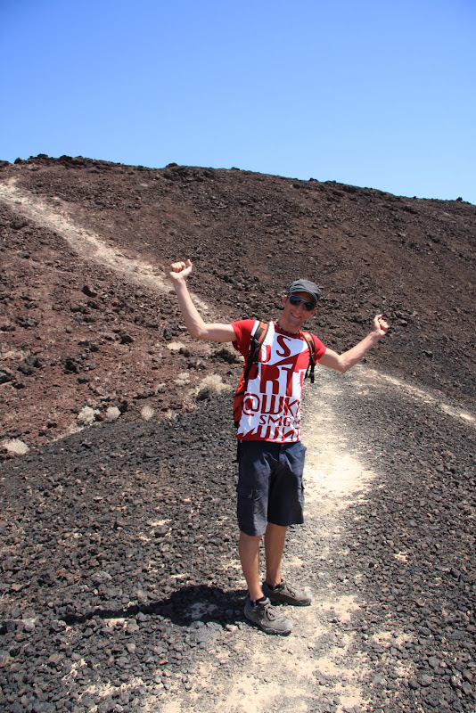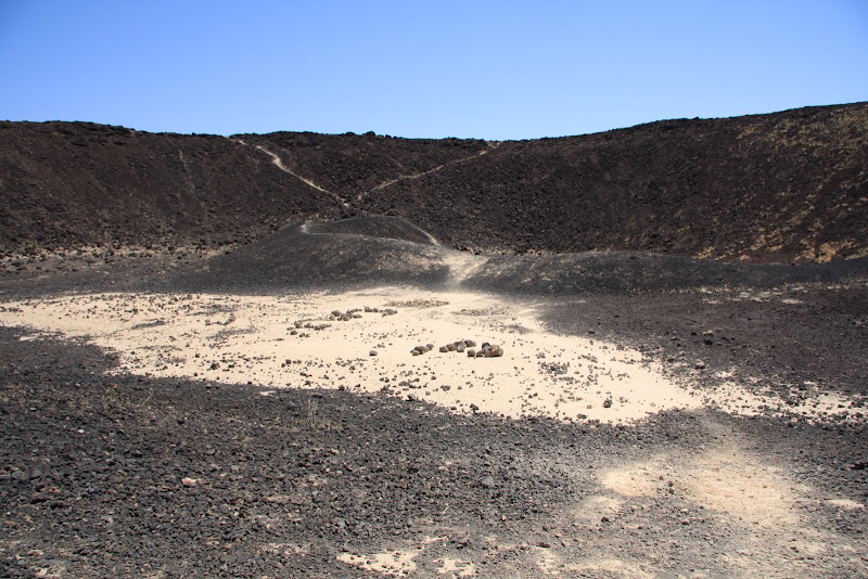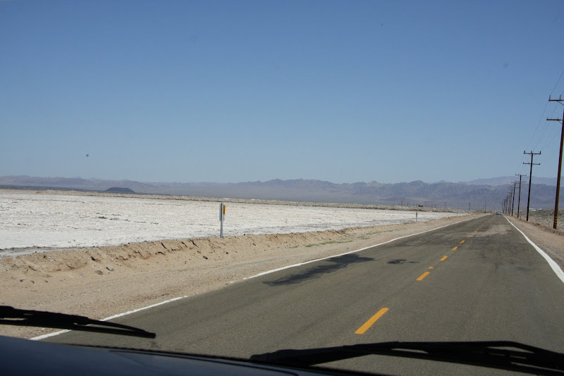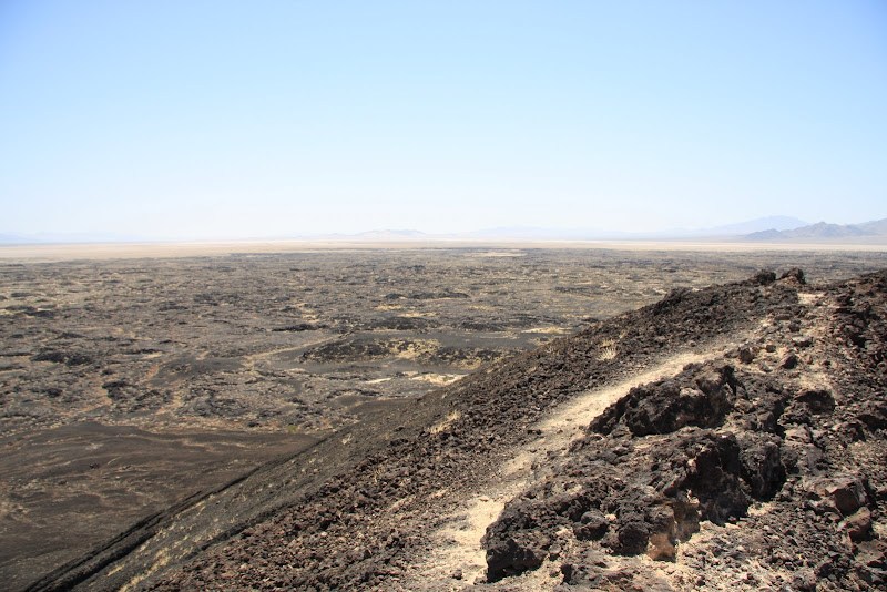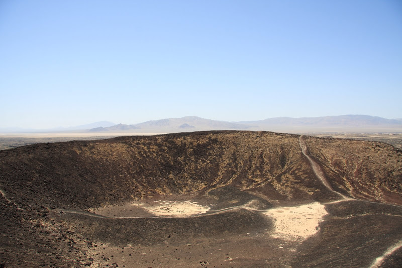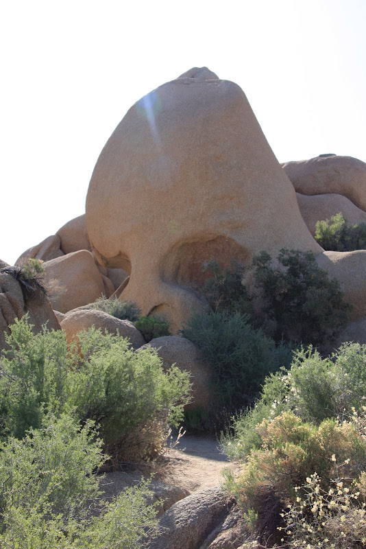 Am nächsten Tag wurden wir so zu sagen von der Sonne geweckt, sie schien dirket durch unser Fenster! Bei mal einer etwas anderen Zmorge-Kulisse liessen wir nochmals die Natur auf uns wirken und der Fels in der Mitte unseres Campingplatzes musste auch noch vor der Abfahrt bestiegen werden! Heute war ich mit Fahren an der Reihe, die Tiere des Parks stellten meine Bremskünste schon nach den ersten paar Meilen auf eine harte Probe, doch Karnickel und Squirrl haben beide Überlebt! Ein kurzer Abstecher im Joshua Park musste allerdings noch sein, der Skull Rock – offensichtlich, warum dieser so hiess! Dann verliessen wir den Park und fuhren Richtung Amboy Crater. Dort angelangt wurden wir fast von der Hitze erschlagen, es war zwar erst 10:30, aber nun wussten wir, warum empfohlen wurde, die 3 stündige Wanderung um den Krater möglichst früh morgens zu machen. Mit 3 Liter Wasser machten wir uns auf den Weg. Die Hitze war knapp aushaltbar: Auf dem Hinweg ging ein angenehmes Lüftchen, und so spürten wir die Hitze nicht so stark. Auch hier waren keine Schlangen in Sicht und auch Taranteln haben wir nicht gesehen, nur Echsen, dafür einige und davon 3 verschiedene Arten! Da der Vulkan schon seit ungefähr 10’000 Jahren nicht mehr aktiv ist, hatten wir hier die Gelegenheit, auch einmal im Krater und auf dem Kraterrand herumzuwandern. Aussicht hatte man auf Amboy (kleines Dörfchen), Railway mit laaangen Zügen & dem Bristol Dry Lake. Langsam aber sicher wurde die Hitze unerträglich (der Wind hatte aufgehört und laut Infotafel, kann es gegen die Mittagszeit 120°F heiss werden – das sind 48°C) und so kehrten wir zu unserem kühlen RV zurück. Wir benötigten für den ganzen Tripp gerade mal 2 Stunden, was aber auch besser so war – waren wir doch sehr erleichtert, als wir kurz die Klimaanlage im RV einschalten konnten!