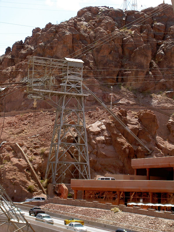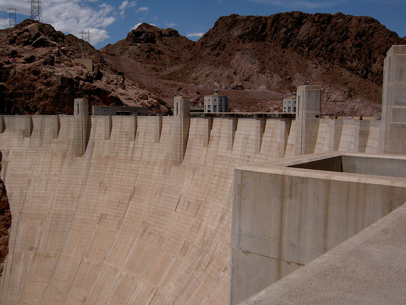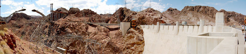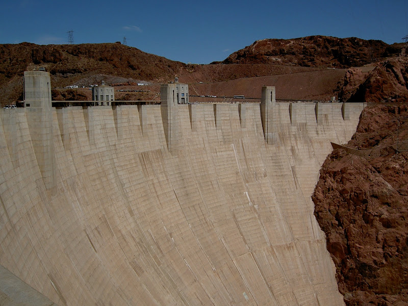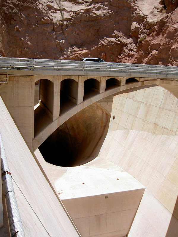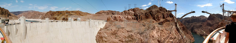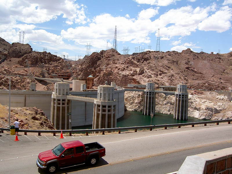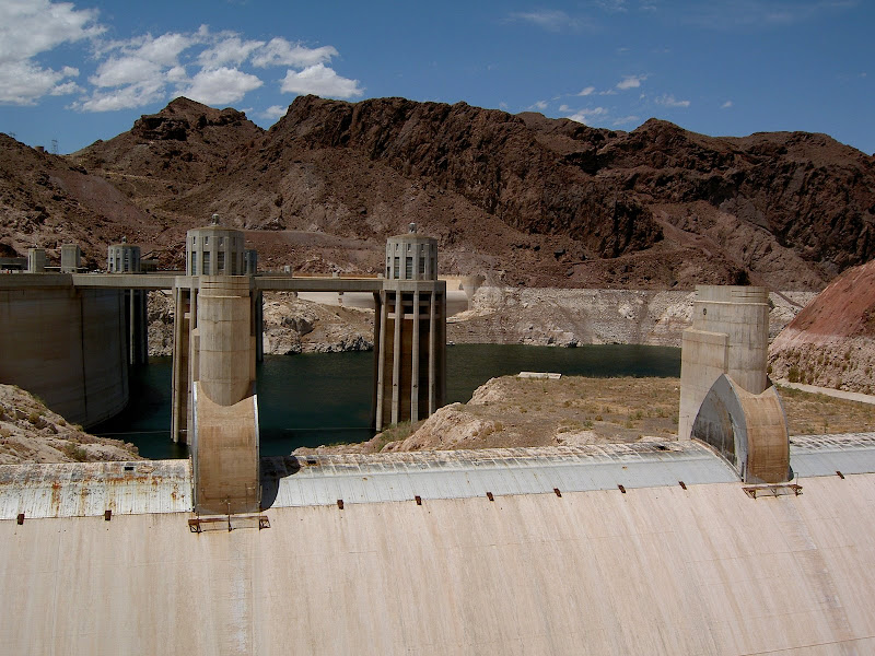 Bevor man zum Hoover Dam gelangt, muss man eine Sicherheitskontrolle passieren. Hier wird das Wohnmobil (wohl nach Bomben) durchsucht. Wir hatten Glück, als Schweizer sahen wir wohl zu harmlos aus und so konnten wir nach einem kurzen Stopp und ein paar geöffneten Stauräumen gleich wieder weiterfahren. Ebenfalls speziell ist, dass momentan der ganze Verkehr über den Hoover Dam geht, eine Brücke zur Entlastung wird erst 2010 fertig. Wir suchten also für unser Wohnmobil einen Parkplatz und machten uns auf den Weg zum Visitor Center. Auf dem Weg konnten wir schon einmal einen Blick auf die Überlauftunnel werfen. Da hatte der See aber noch einiges „spazig“! Bestaunt wurden auch die 4 Wassertürme, die, wie wir später herausfanden, nicht auf dem Grund des Sees stehen, sondern auf den Seitenwänden des Canyons angebracht sind. Durch diese Inlet Towers (Ansaugtürme) wird das Wasser zu den Turbinen geführt. Nun aber zum Visitor Center: Dort angekommen entschieden wir uns nur für den Besuch des 8$ Visitor Centers und verzichteten auf die 30$ Dam Tour. Schliesslich hatten wir ja erst letzte Woche einen Staudam von innen gesehen. Der Besuch ins Visitorcenter hat sich definitiv gelohnt, so erfuhren wir die Details zur Entstehung und durften auch die etwas seltsamen Todesmeldungen der damaligen Zeit lesen. Zum Schluss wurden wir noch mit Aussicht über Dam, Colorade River und halbfertiger Brücke belohnt.