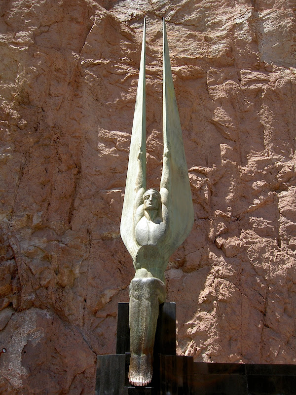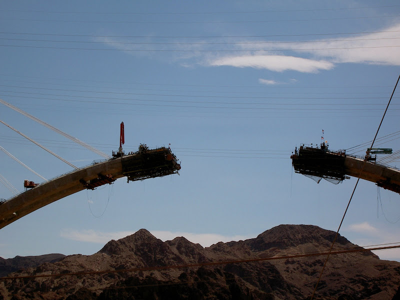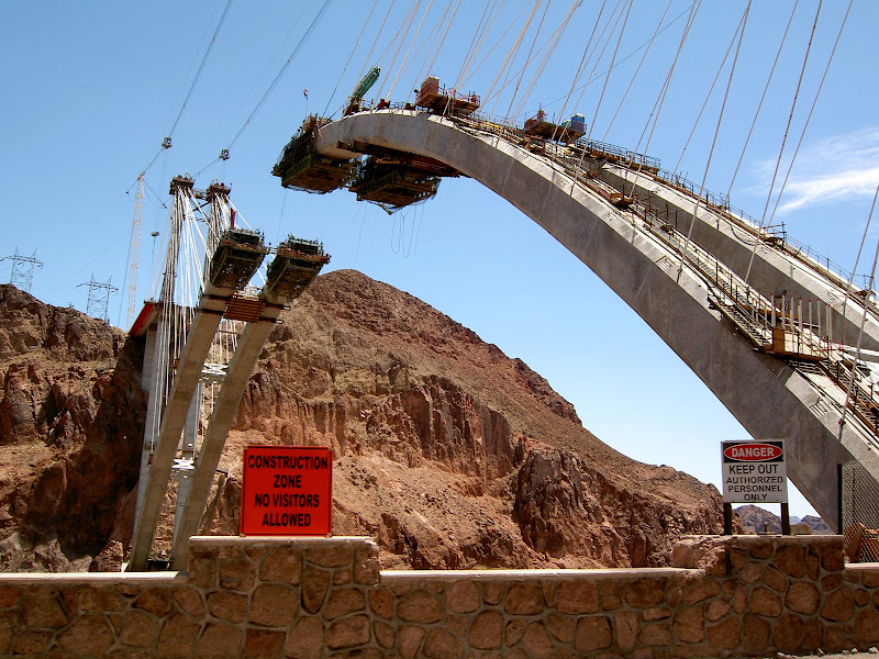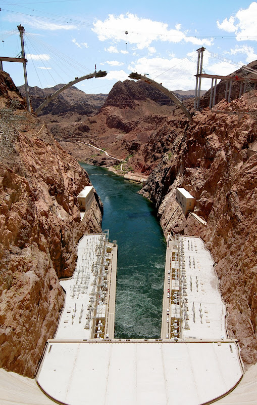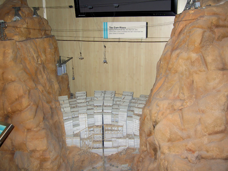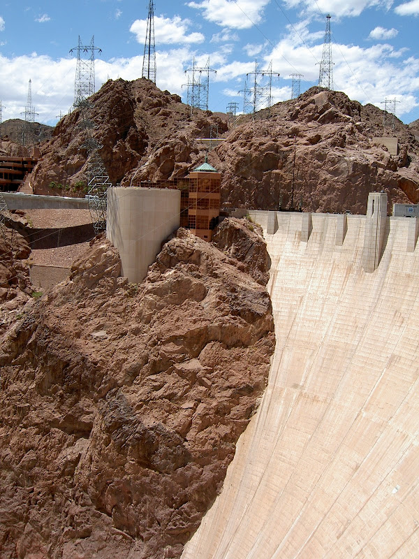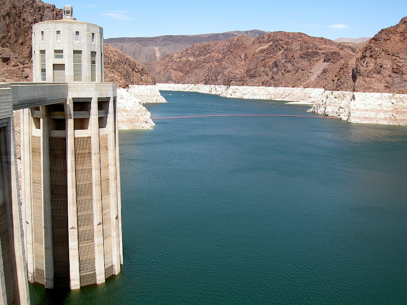 Bevor man zum Hoover Dam gelangt, muss man eine Sicherheitskontrolle passieren. Hier wird das Wohnmobil (wohl nach Bomben) durchsucht. Wir hatten Glück, als Schweizer sahen wir wohl zu harmlos aus und so konnten wir nach einem kurzen Stopp und ein paar geöffneten Stauräumen gleich wieder weiterfahren. Ebenfalls speziell ist, dass momentan der ganze Verkehr über den Hoover Dam geht, eine Brücke zur Entlastung wird erst 2010 fertig. Wir suchten also für unser Wohnmobil einen Parkplatz und machten uns auf den Weg zum Visitor Center. Auf dem Weg konnten wir schon einmal einen Blick auf die Überlauftunnel werfen. Da hatte der See aber noch einiges „spazig“! Bestaunt wurden auch die 4 Wassertürme, die, wie wir später herausfanden, nicht auf dem Grund des Sees stehen, sondern auf den Seitenwänden des Canyons angebracht sind. Durch diese Inlet Towers (Ansaugtürme) wird das Wasser zu den Turbinen geführt. Nun aber zum Visitor Center: Dort angekommen entschieden wir uns nur für den Besuch des 8$ Visitor Centers und verzichteten auf die 30$ Dam Tour. Schliesslich hatten wir ja erst letzte Woche einen Staudam von innen gesehen. Der Besuch ins Visitorcenter hat sich definitiv gelohnt, so erfuhren wir die Details zur Entstehung und durften auch die etwas seltsamen Todesmeldungen der damaligen Zeit lesen. Zum Schluss wurden wir noch mit Aussicht über Dam, Colorade River und halbfertiger Brücke belohnt.