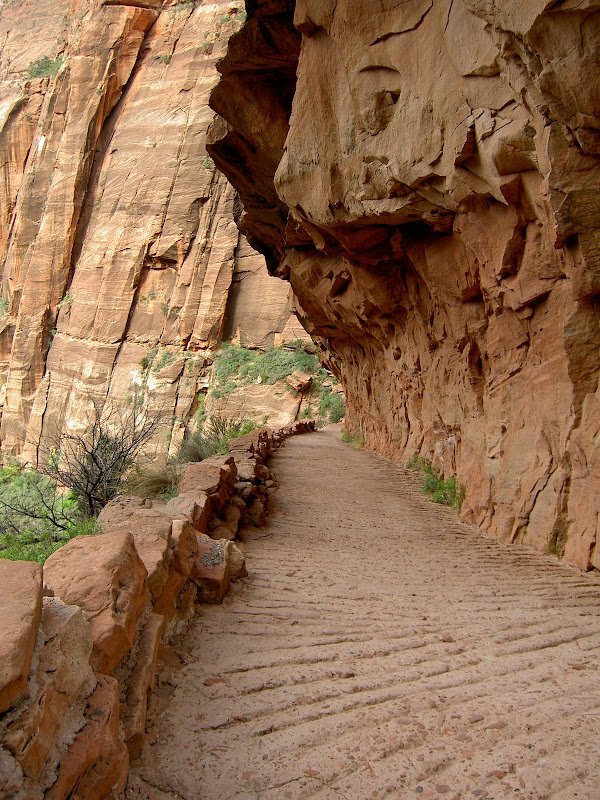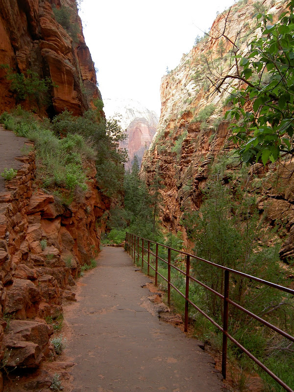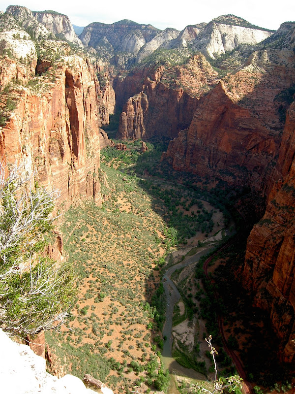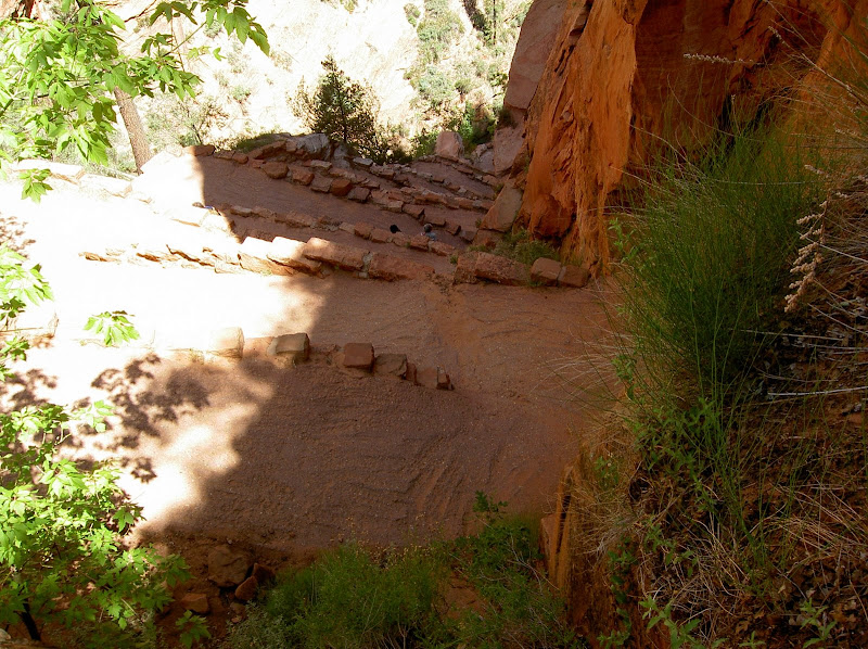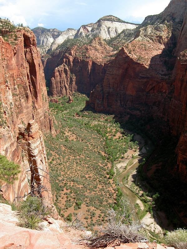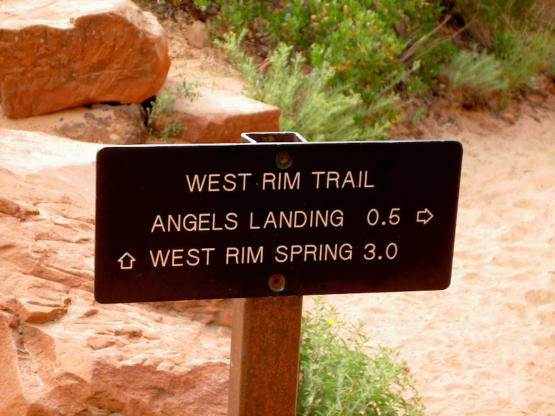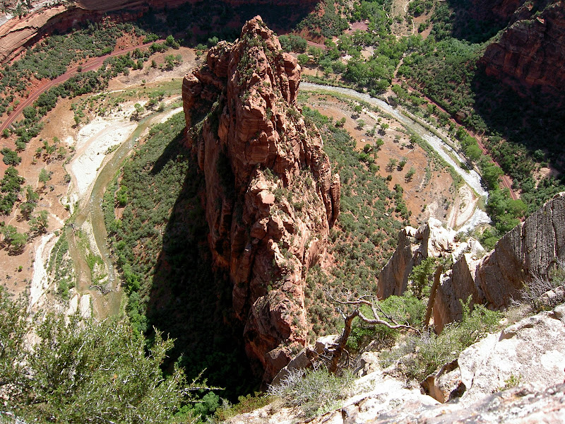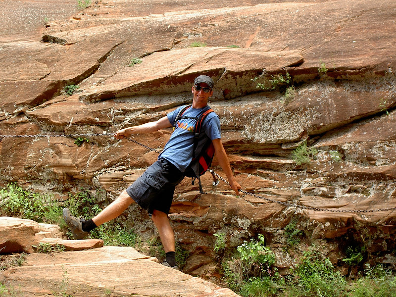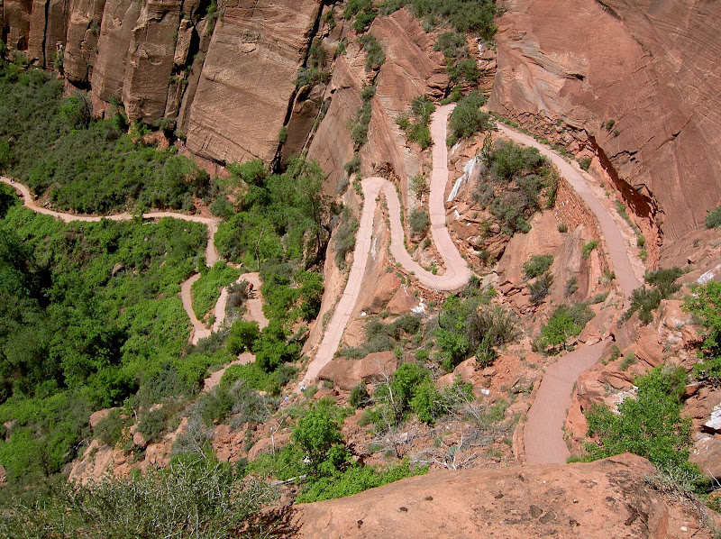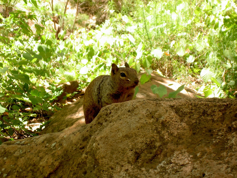 Als erstes knöpften wir uns den Angels Landing Trail vor. Von diesem Wanderweglein versprachen wir uns viel, denn – man wurde mehrfach davon gewarnt, den Trail zu durchwandern, wenn man Höhenangst hat. Nach der kurzen Fahrt mit dem im 6min Takt fahrenden Bus hatten wir den Start des Trails erreicht. Nach der Überquerung des Virgin River schlängelt sich der Weg entlang der steilen Felswände nach oben. Vielfach war der Weg sozusagen in der Felswand eingemeisselt und versenkt. Nach dem ersten Aufstieg folgte ein kurzer Weg in einer kleinen, kühlen Schlucht. Nach dieser Schlucht folgt ein weiterer spektakulärer Weg: Walter Wiggles. In 21 sehr steilen, engen Spitzkehren schlängelt sich der Weg die senkrechte Wand des Canyons nach oben zum ersten Aussichtspunkt. Viele Wanderer geben sich mit diesem Aussichtspunkt – Scout Overlook – zufrieden, den nun folgt die letzte halbe Meile als Kletterweg bis zum Angels Landing. Dieser letzte Abschnitt ist teilweise nicht breiter als 2m und fällt auf beiden Seiten bis 500m bis zum Canyongrund ab! Schlussendlich wurden wir dann mit dem gigantischen Ausblick auf dem exponierten, 1950m hoch gelegenen Angels Landing belohnt. Wir picknickten zusammen mit herumirrender Chipmunks.