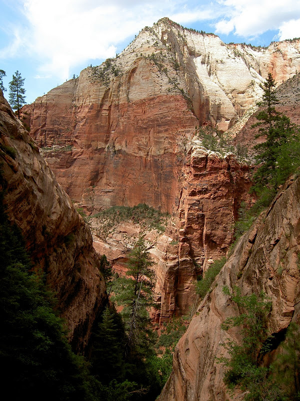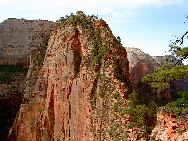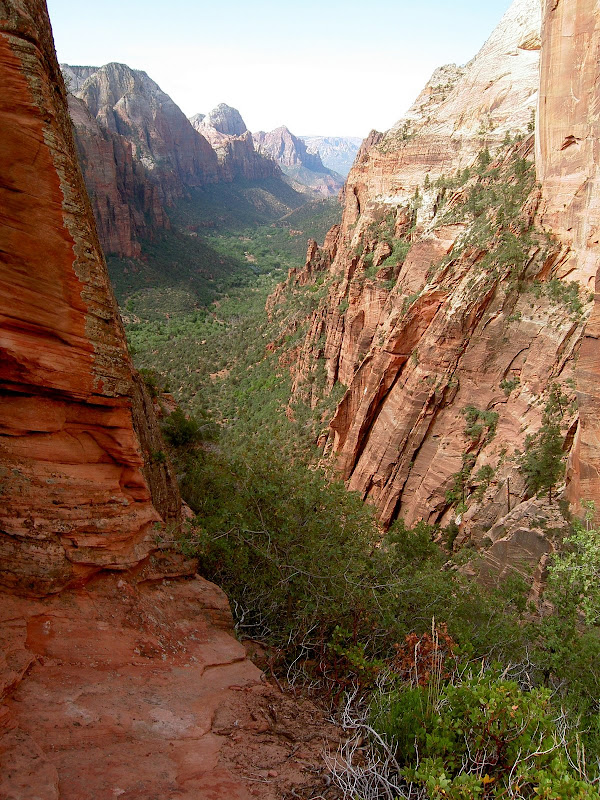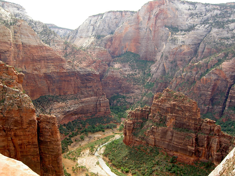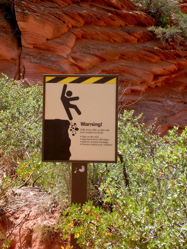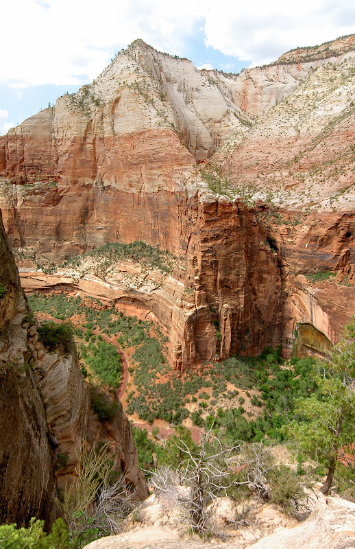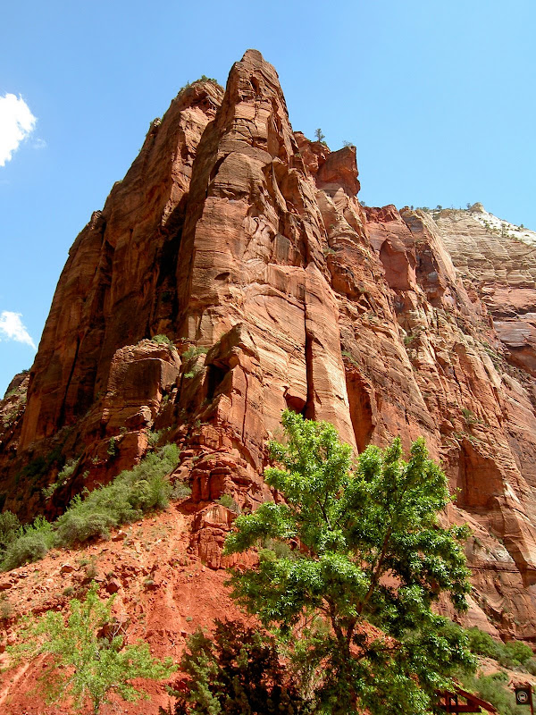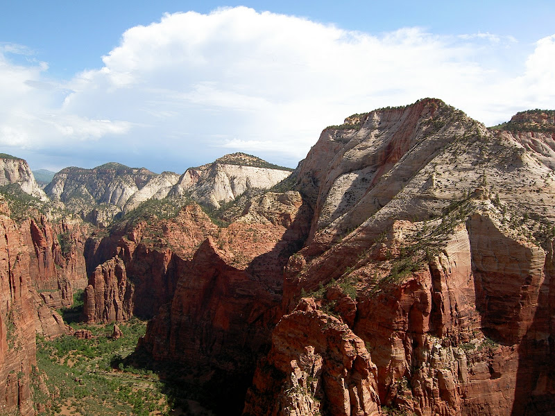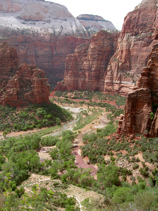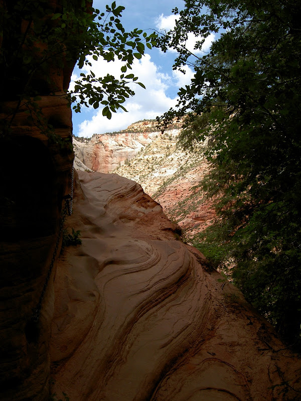 Als erstes knöpften wir uns den Angels Landing Trail vor. Von diesem Wanderweglein versprachen wir uns viel, denn – man wurde mehrfach davon gewarnt, den Trail zu durchwandern, wenn man Höhenangst hat. Nach der kurzen Fahrt mit dem im 6min Takt fahrenden Bus hatten wir den Start des Trails erreicht. Nach der Überquerung des Virgin River schlängelt sich der Weg entlang der steilen Felswände nach oben. Vielfach war der Weg sozusagen in der Felswand eingemeisselt und versenkt. Nach dem ersten Aufstieg folgte ein kurzer Weg in einer kleinen, kühlen Schlucht. Nach dieser Schlucht folgt ein weiterer spektakulärer Weg: Walter Wiggles. In 21 sehr steilen, engen Spitzkehren schlängelt sich der Weg die senkrechte Wand des Canyons nach oben zum ersten Aussichtspunkt. Viele Wanderer geben sich mit diesem Aussichtspunkt – Scout Overlook – zufrieden, den nun folgt die letzte halbe Meile als Kletterweg bis zum Angels Landing. Dieser letzte Abschnitt ist teilweise nicht breiter als 2m und fällt auf beiden Seiten bis 500m bis zum Canyongrund ab! Schlussendlich wurden wir dann mit dem gigantischen Ausblick auf dem exponierten, 1950m hoch gelegenen Angels Landing belohnt. Wir picknickten zusammen mit herumirrender Chipmunks.
