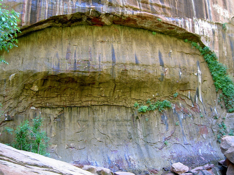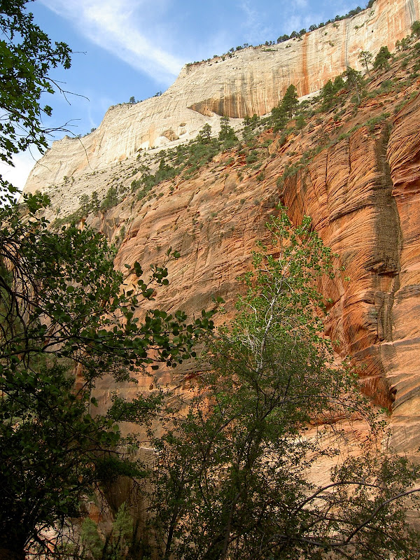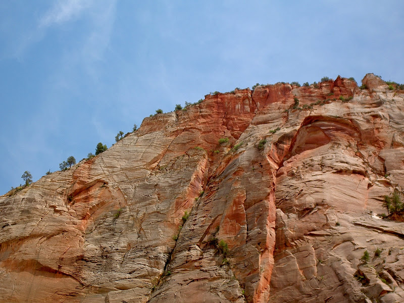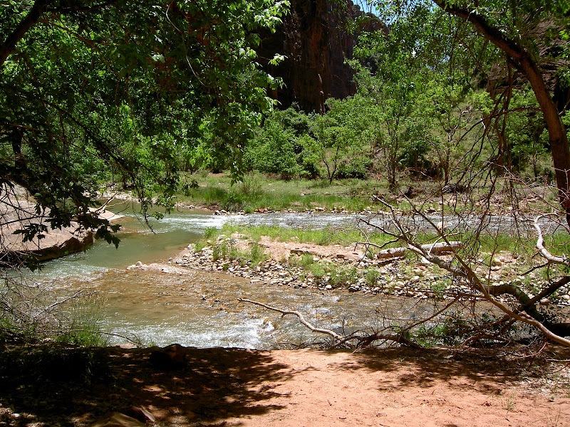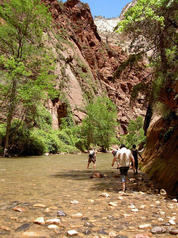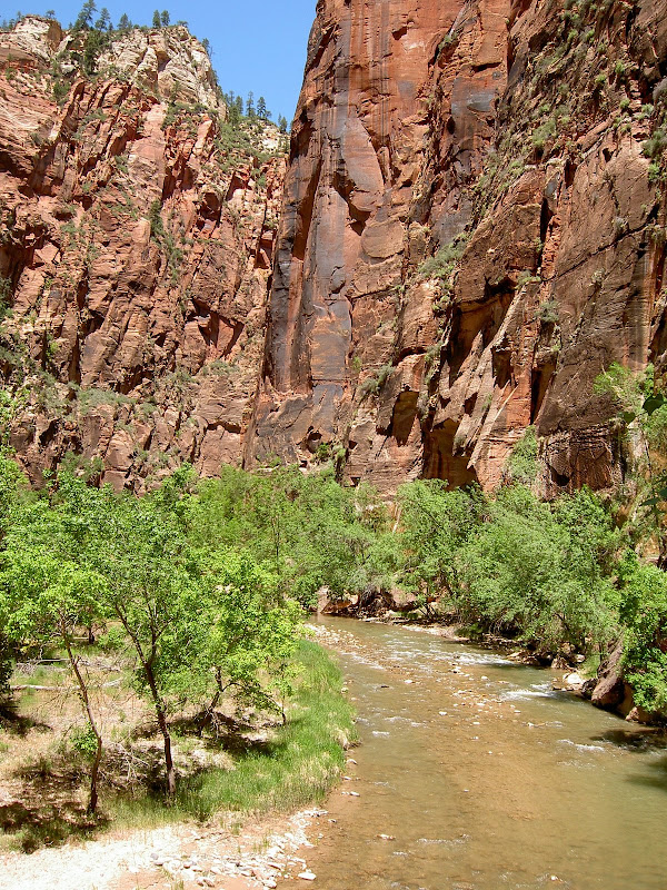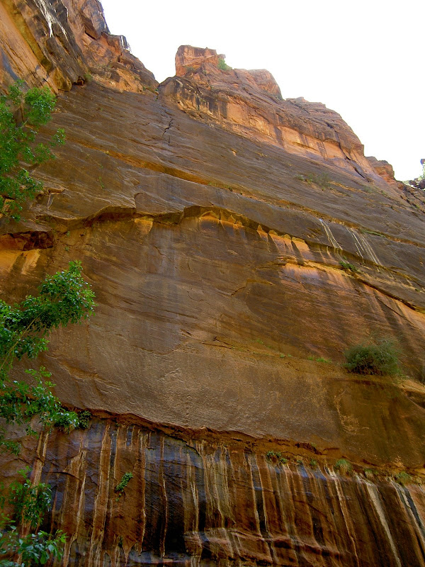Nach dieser 3h Wanderung stand ein lockerer Mittagsspaziergang auf dem Programm. Wiederum mit dem Shuttle Bus fuhren wir bis ans Ende des erschlossenen Zion Canyons. Von dort aus führt ein Spazierweg weiter Flussaufwärts in den immer enger werdenden Canyon. Neben Sümpfen sieht man auf diesem Weg auch sogenannte hängende Gärten. Pflanzen, die an der Wand wachsen und vom Wasser, das aus dem Fels austritt leben. Das Wasser vom Felsen ist dann nicht etwa mit grundwasser zu vergleichen. Dieses Wasser „fliesst“ durch den porösen, 600m hohen Navajo Sandstein. Vom Regen bis zum Austritt kann das Wasser 1000-4000 Jahre im Navajo Sandstein unterwegs sein! Nach einer Meile findet nach der Strasse auch dieser Weg am Fluss ein Ende. Der Canyon ist an diesem Punkt gerade noch so breit wie der Fluss, aber gut 700m hoch!