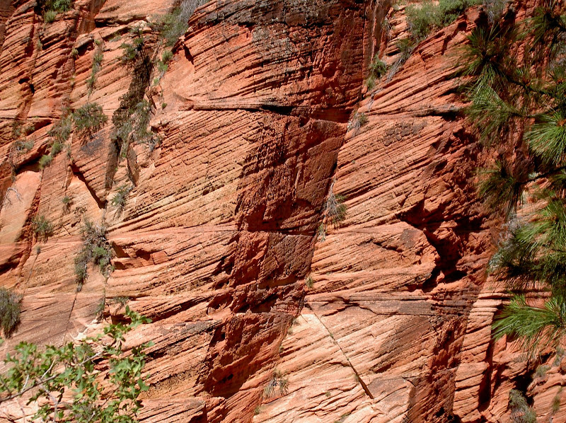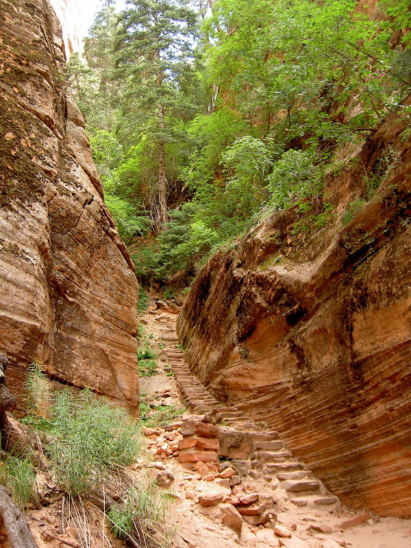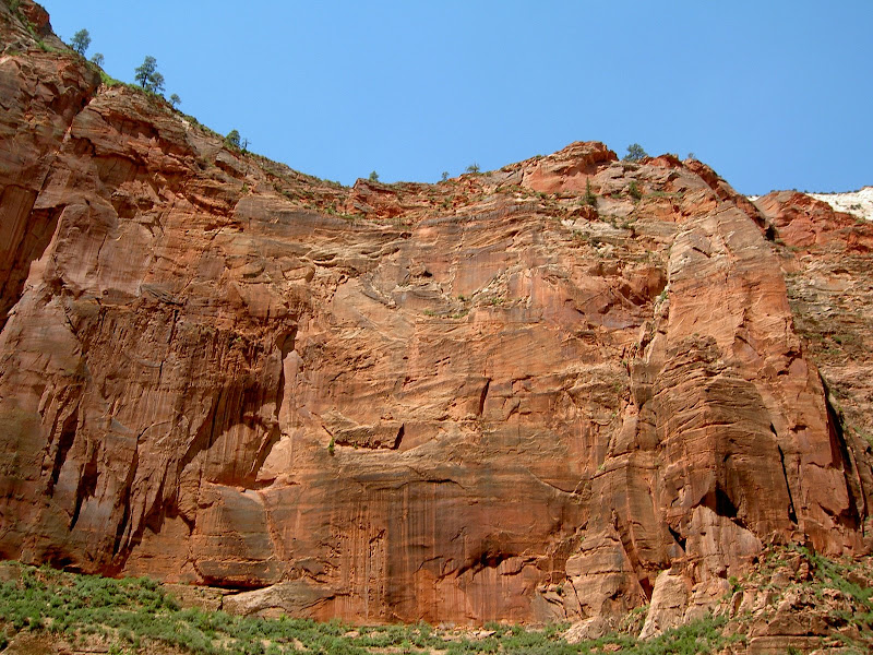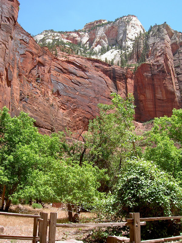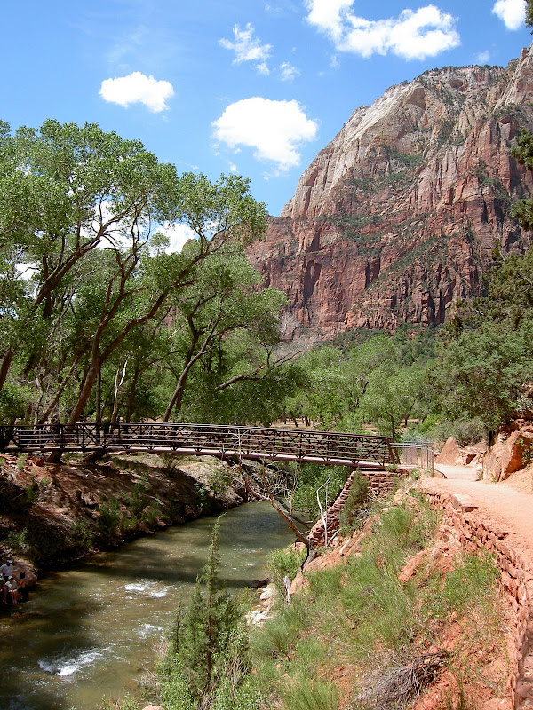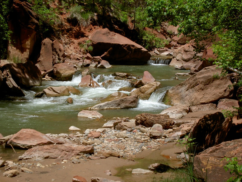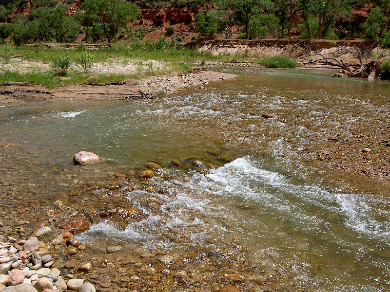 Nach dieser 3h Wanderung stand ein lockerer Mittagsspaziergang auf dem Programm. Wiederum mit dem Shuttle Bus fuhren wir bis ans Ende des erschlossenen Zion Canyons. Von dort aus führt ein Spazierweg weiter Flussaufwärts in den immer enger werdenden Canyon. Neben Sümpfen sieht man auf diesem Weg auch sogenannte hängende Gärten. Pflanzen, die an der Wand wachsen und vom Wasser, das aus dem Fels austritt leben. Das Wasser vom Felsen ist dann nicht etwa mit grundwasser zu vergleichen. Dieses Wasser „fliesst“ durch den porösen, 600m hohen Navajo Sandstein. Vom Regen bis zum Austritt kann das Wasser 1000-4000 Jahre im Navajo Sandstein unterwegs sein! Nach einer Meile findet nach der Strasse auch dieser Weg am Fluss ein Ende. Der Canyon ist an diesem Punkt gerade noch so breit wie der Fluss, aber gut 700m hoch!