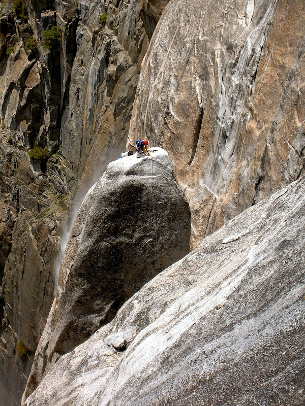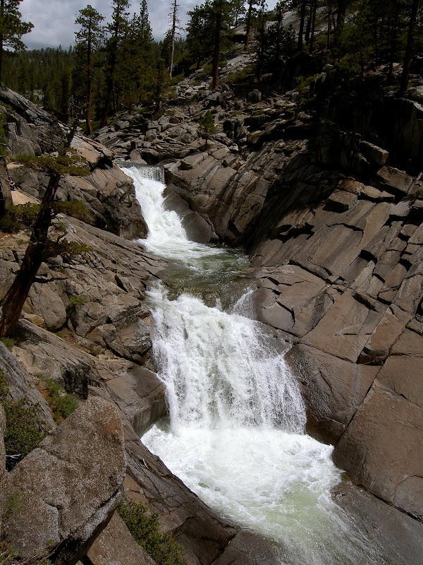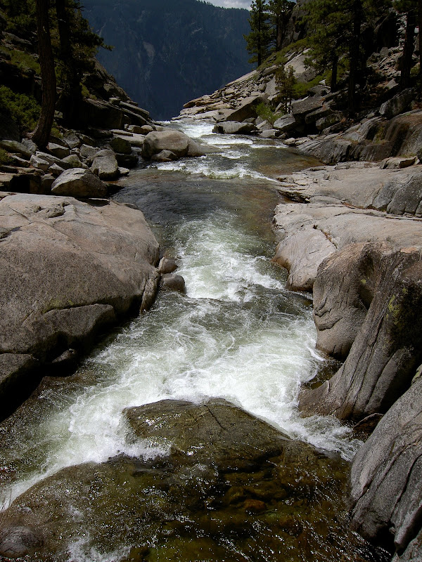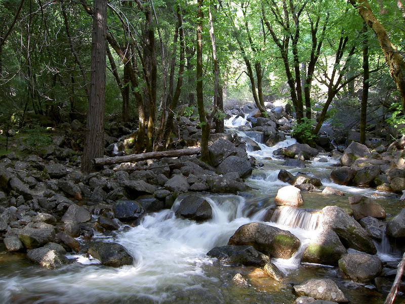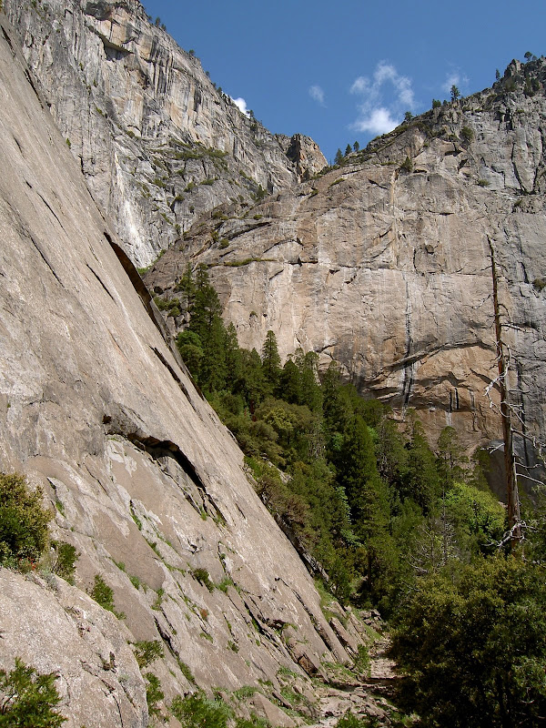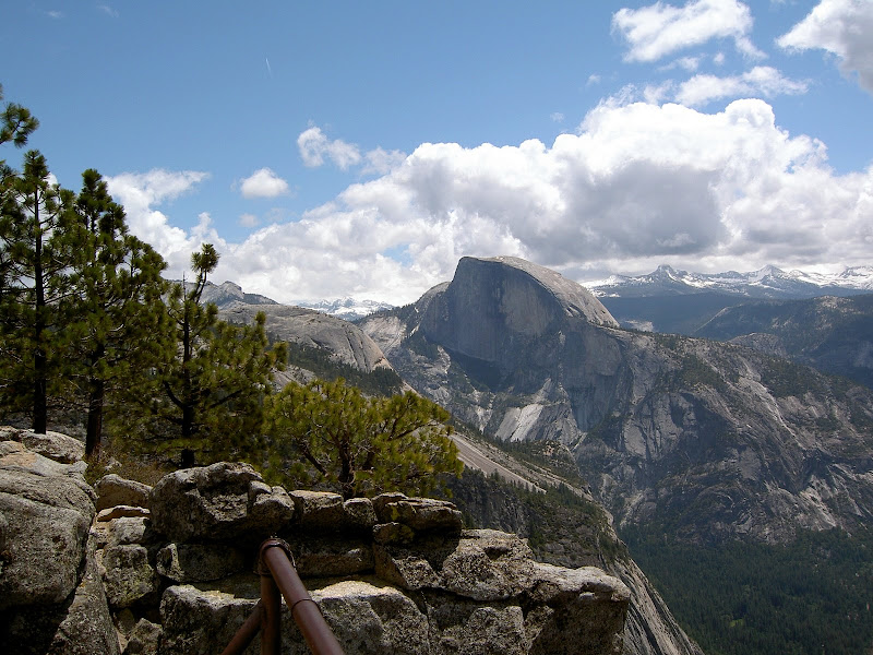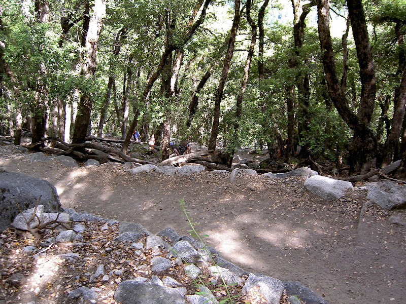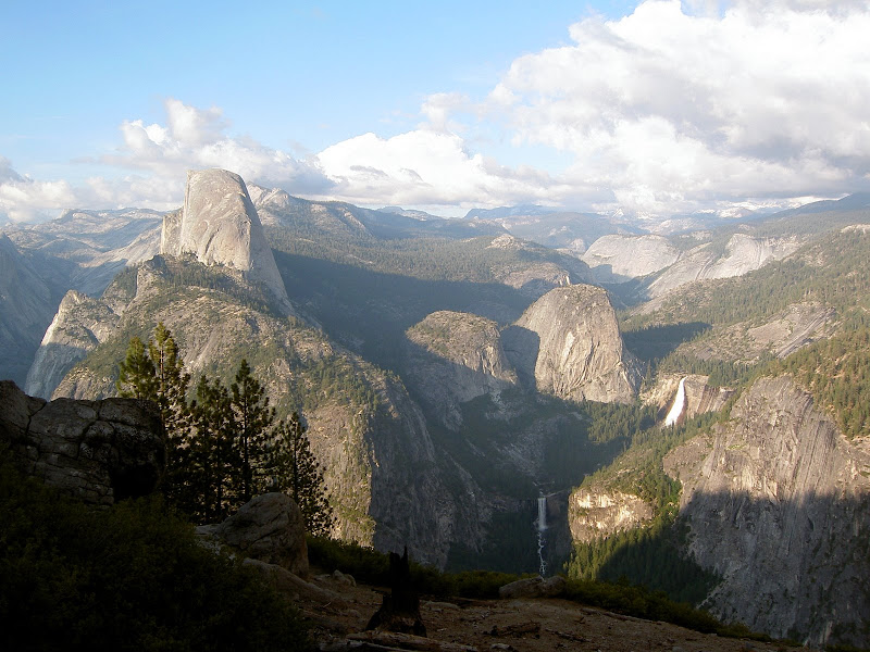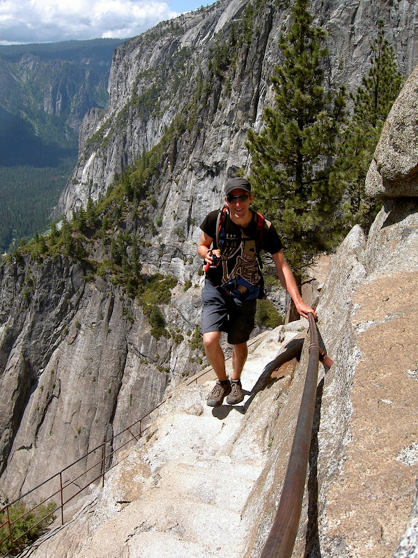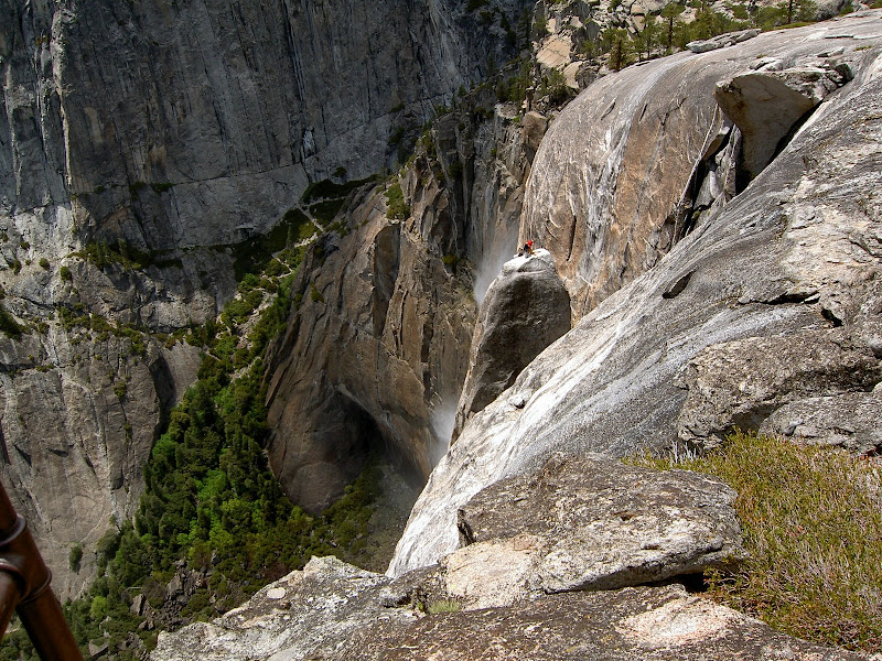 Nach der Überquerung des Yosemite Falls Creek (Bach) steigt man nocheinmal ein paar hundert Meter nach oben und gelangt schliesslich zum Yosemite Point. Hier sieht man, wie weit der Yosemite Fall tatsächlich nach unten „fällt“. Nichts für Personen mit Höhenangst! Dafür war die Umgebung des Yosemite Points sehr gemütlich. Wir beschlossen daher, hier zu picknicken. Pascal fand auch einen schönen Stein, geriet aber ins Revier einer Eidechse, die ganz mutig an Pascals T-Shirt zupfte! Wegen des Grössenverhältnisses gab sie sich dann aber geschlagen und somit konnten wir ungestört ein Nickerchen machen.