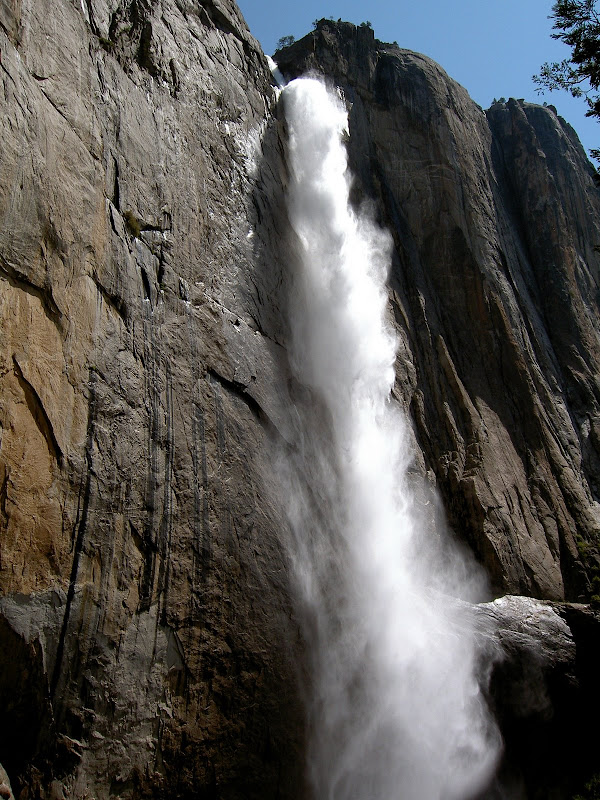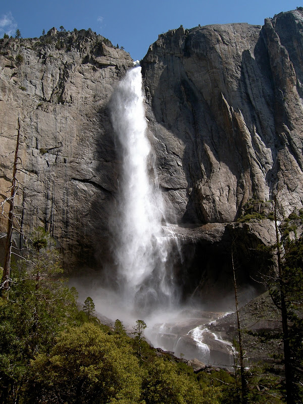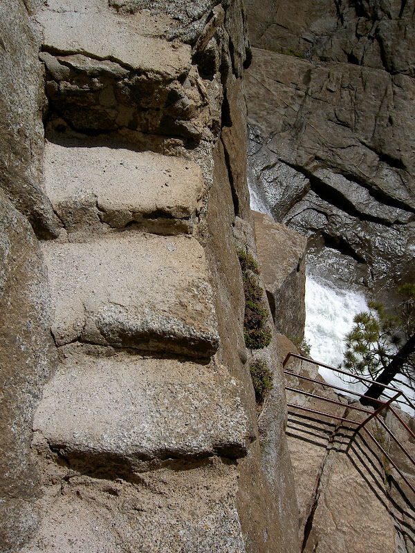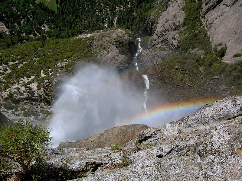 Wir wollten aber nun doch noch ganz zum Urpsrung des Wasserfalls. Also wanderten wir nochmals ein paar Meilen und Switchbacks zum Yosemite Falls Overlook. An diesem Punkt befindet man sich an der Klippe und darf über ein Geländer dem Wasserfall quasi über die Schultern schauen. Selbstverständlich mit der obligathen Gischt von unten.