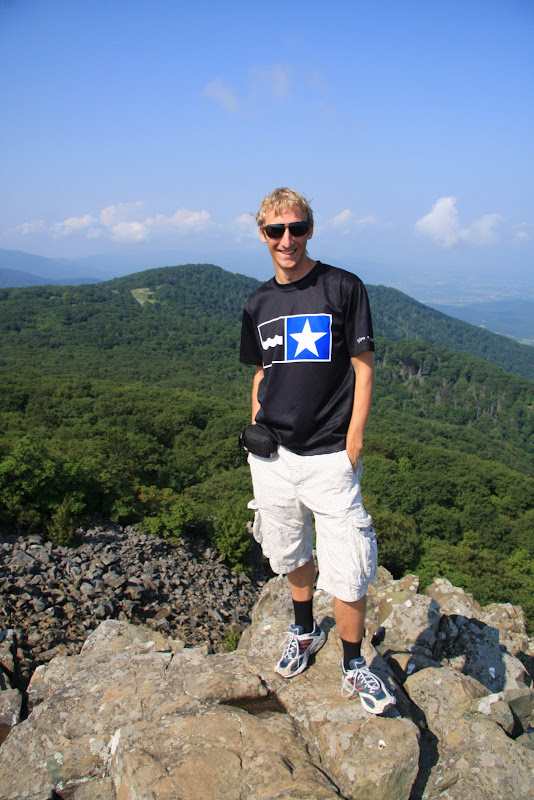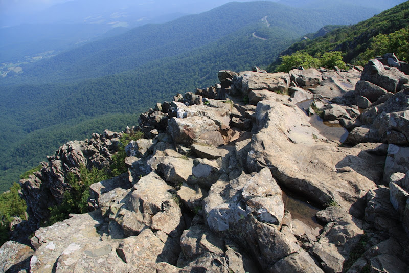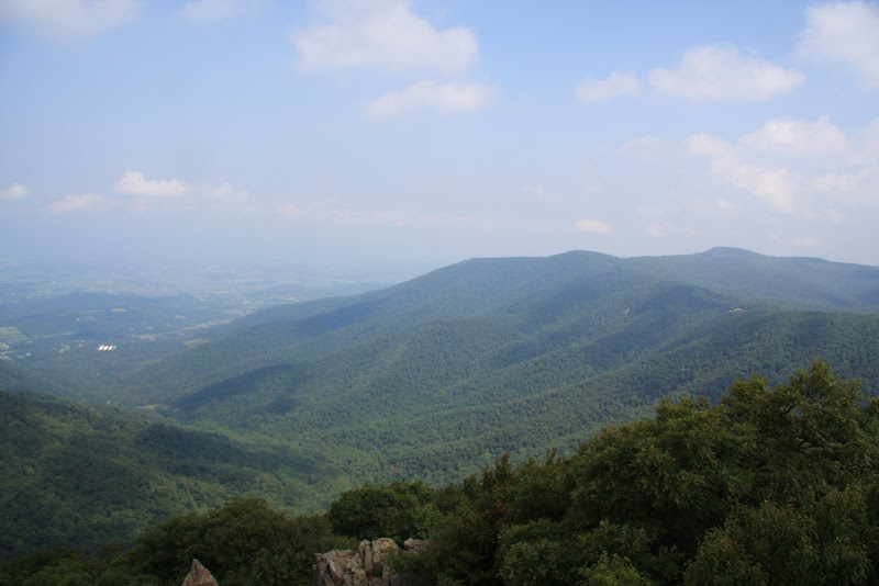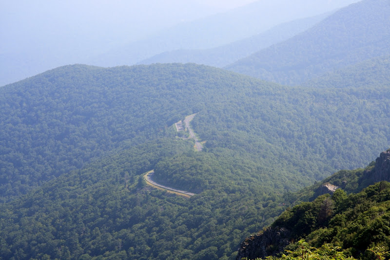 Am nächsten Morgen (3. August) standen wir früh auf, um bald darauf zurück auf dem Skyline Drive die Sonne zu geniessen. Immer wieder hielten wir an Aussichtspunkten, die Sicht war nach den vielen regnerischen Tagen allerdings sehr dunstig. Weiter stoppten wir auch unterwegs um kurze Wanderungen zu unternehmen. Zum einen liefen wir auf den höchsten und zweithöchsten Punkt im Park, dem Stony Man und dem Hawksbill Mountain. Hier genoss man 360° Panoramas. Weiter wanderten wir zum Rose River Wasserfall. Doch auch hier fanden wir eher ein Rinnsal, welches über eine 5m „Klippe“ in die „Tiefe“ „stürzte“.