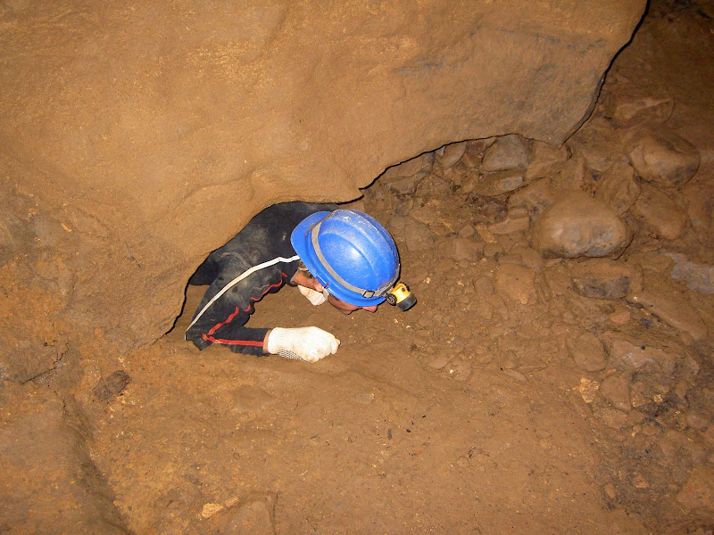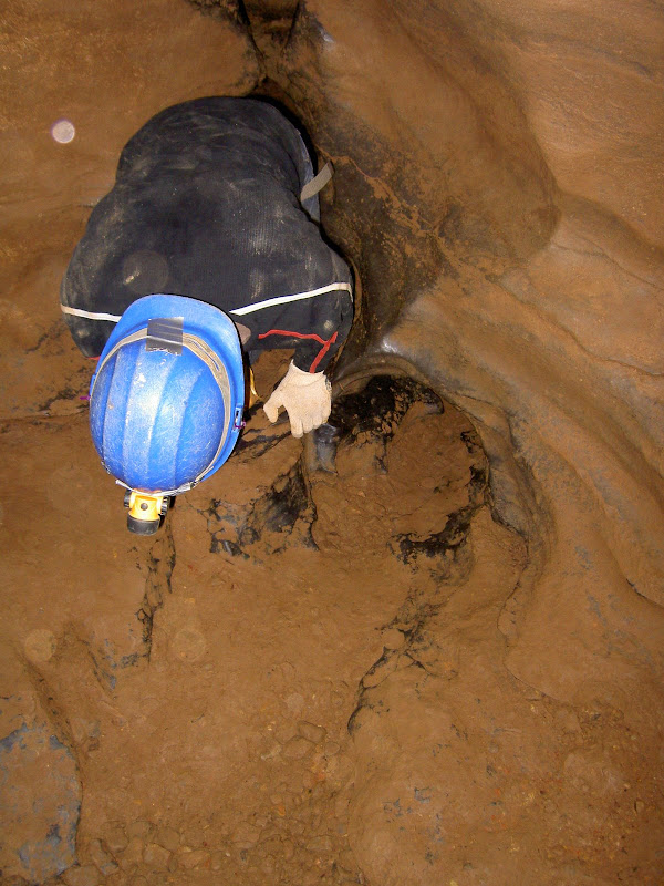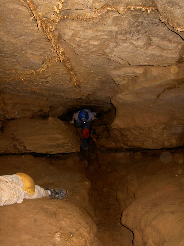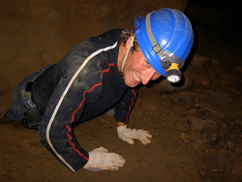 Selbstverständlich zeigte uns Kyle auch verschiedenste Gebilde in der Tropfsteinhöhlen, von Stalgniten, Flowstones bis zu Fossilien in der Decke. Das war ja schön und gut, aber eigentlich nur unnötige Ablenkung vor unserem zweiten engen Loch 😉 Das Loch am Ende eines engen Tunnels wurde Bonebreaker (also Knochenbrecher) genannt, sicherlich auch nicht grundlos. Man musste hier im Tunnel um eine 90° Ecke kriechen und schlüpfte dann durch dieses enge Loch in den nächsten Raum. Sehr amüsant, wie man auf dem Foto erkennen kann 🙂