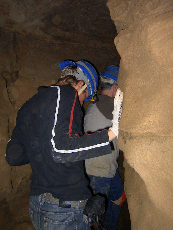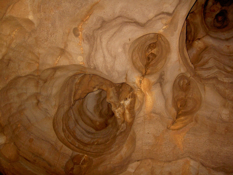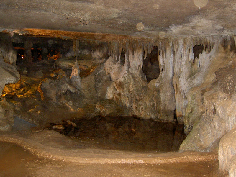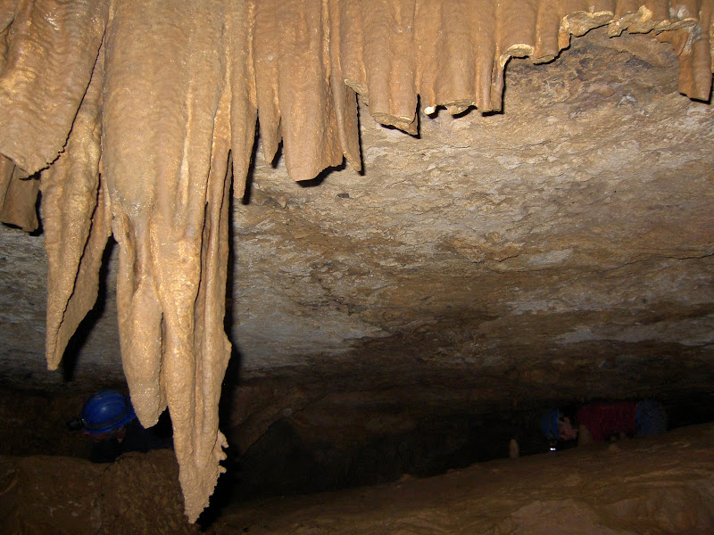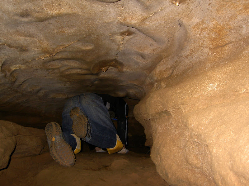 Das nächste Highlight liess nicht lange auf sich warten: Die Sandpaper Slide (Sandpapier-Rutsche). Hier rutschte man auf dem Hintern etwa 8m weit, mit besonderer Konzentration auf die Landung am Schluss (da war ein 1m Absatz am Schluss). Die Schuhe waren unterdessen schon brutal dreckig – nun was gibt es da besseres, als durch einen kleinen Höhlenbach zu laufen? vermeiden konnte man das 10cm tiefe Wasser nicht, so waren die Schuhe zwar kurzerhand vom Dreck befreit, dafür aber nass bis auf die Socken. In Gedanken an die heisse Luft draussen war das aber eine schöne Abkühlung (in der Höhle drinn war es angenehme 15°C).