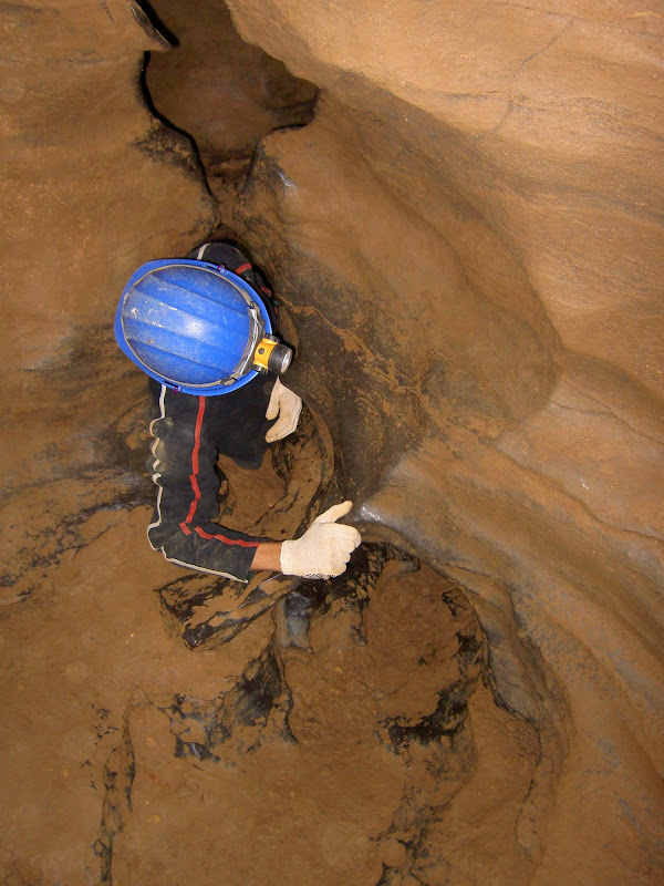 Nach weiteren Kriechen, Klettern und Arschrutschen gelangten wir in einen Gang, der von kleinen Salamandern bewohnt wird. Wir sahen tatsächlich etwa 5 schwarze, 3cm lange Tierchen an den Wänden kleben. Unsere Gruppe war aus sportlichen Erwachsenen zusammengestellt – das glaubte jedenfalls unser Guide. Diese Constellation erlaubte es uns eine schwierigere Route zu entdecken. Genannt „The Canyon“ war der nächste Tunnel tatsächlich eine Art Canyon, der früher mal durch Wasser geformt wurde. Nun liefen wir aber nicht am Boden des Canyon’s, sondern auf halber Höhe. Der Canyon war hier ein schmaler, 3-5m tiefer Spalt mit jeweils einem Sims auf der recht oder linken Seite. So musste man als erstes seitwärts gehen – mit den Füssen auf der rechten Canyonseite und den stützenden Händen an der linken Canyonwand. Man muss sich den schönen Blick nach unten vorstellen! Dann kamen teilweise Stellen, wo man die Seite wechseln musste oder mit jeweils einem Bein auf der einen Seite und mit dem anderen auf der anderen Seite lief.