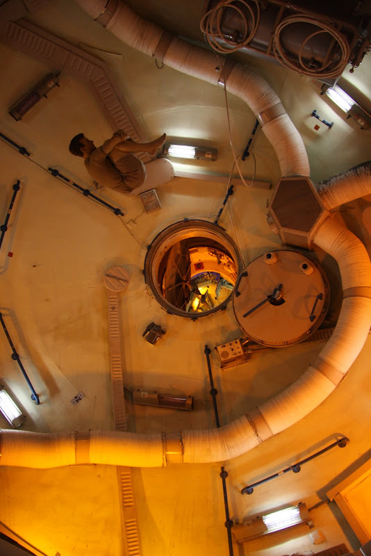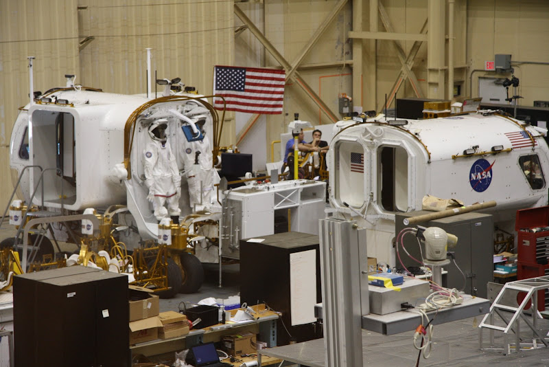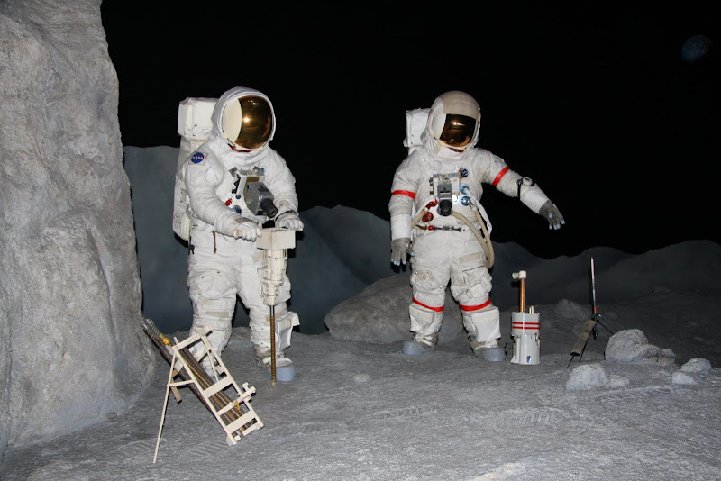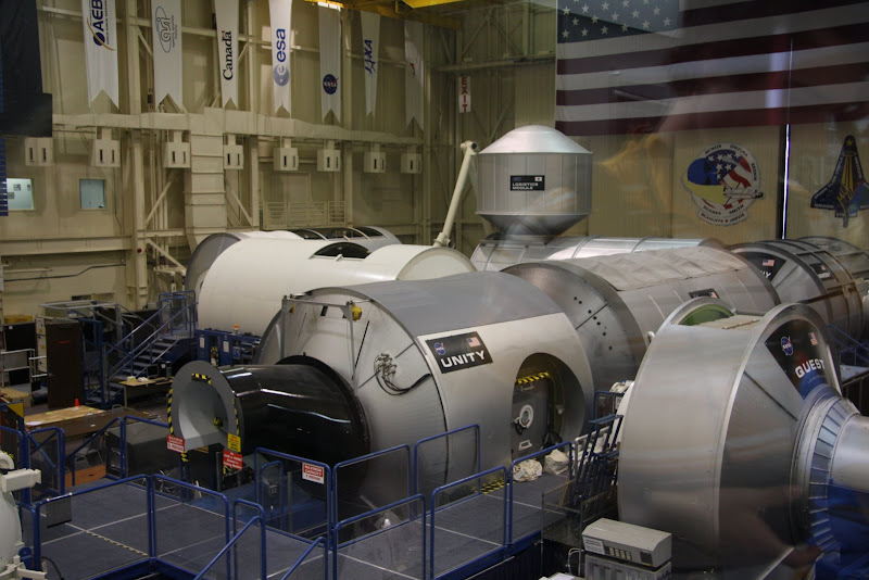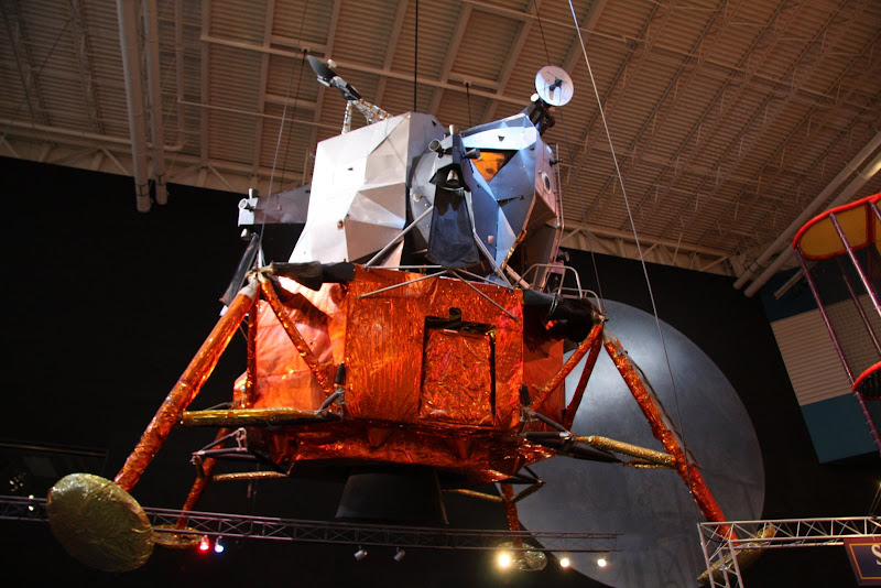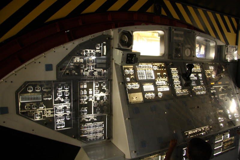 Nach unserer Ankunft kurz nach Öffnung des Museums sahen wir als erstes die Show „Blast Off“. Nach einem Countdown und Start des Shuttles auf Leinwand und mit ohrenbetäubendem Sound wurde man hier über die aktuellen Shuttle- und ISS Missionen informiert. Als nächstes warteten wir auf eine Tramtour – das ist wohl das Highlight des Museums. Je nach Tour, die man auswählt fährt man mit dem Tram auf das NASA Gelände und besichtigt das Kontrollzentrum oder das Astronautentrainingscenter. Wir entschieden uns für letzteres und fuhren bald darauf an Gebäuden vorbei, wo zum Beispiel 400kg Mondgestein aller Apollo Missionen lagern und untersucht werden. In einem anderen Gebäude werden Geräte mit flüssigen, ultra kalten Stickstoff (hab ich das richtig in Erinnerung?) auf die Funktionsbereitschaft im Weltall getestet. Dann gelangten wir zum Trainingscenter der Astronauten. Die riesige Halle war vollgestopft mit Nachbauten von ISS Modulen, Soyus und Spaceshuttles. Diese Trainingsmodule sahen lediglich von aussen nicht ganz originalgetreu aus – im Innern wurde alles 1:1 nachgebaut, um Astronauten auf ihre Arbeit im Weltall vorzubereiten. Neben den Modulen konnte man den aktuellsten Raumanzug sehen, sowie einen beeindruckenden, flügellosen Shuttle-Nachbau. Der Roboterarm des Laderaums musste allerdings ein bisschen verstärkt werden – ansonsten könnte dieser in der Erdgravitation nicht einmal sein eigenes Gewicht heben. Besonderes Highlight: In der hinteren Ecke der Halle waren Ingenieur daran, das neue Mondfahrzeug zu entwickeln! Da sind wir doch gespannt, ob es dieses Vehikel dann wirklich bis zum Mond schaffen wird (hoffentlich wird das Budget der NASA nicht weiter gekürzt!).