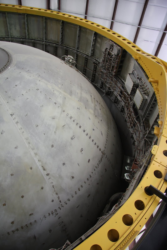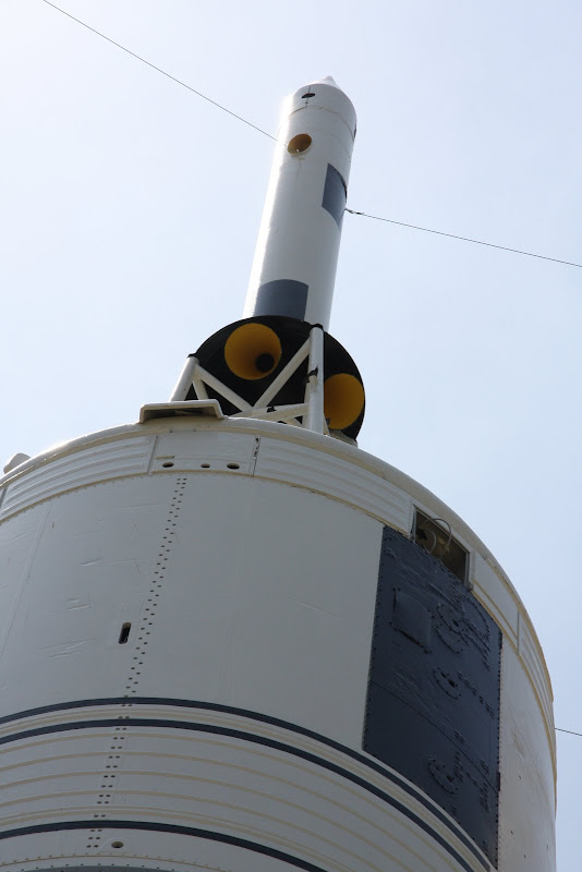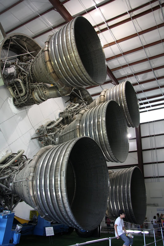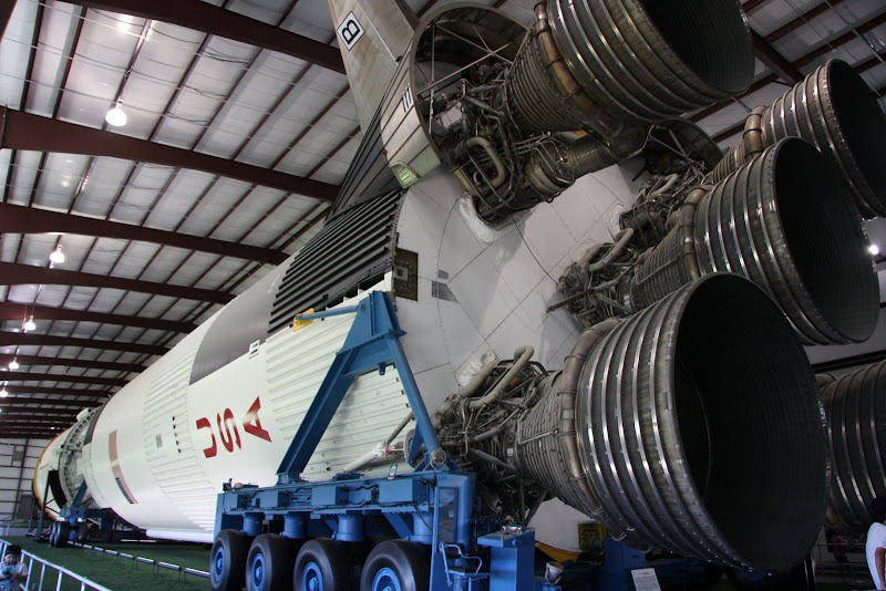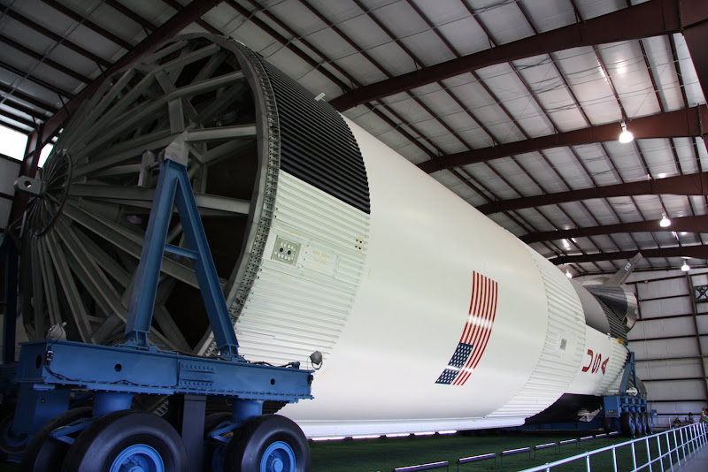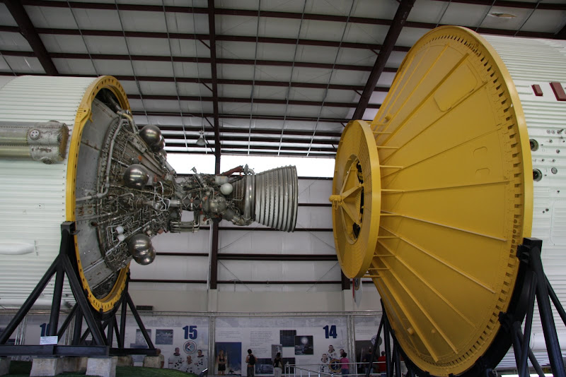 Nach dieser Trainingshalle fuhr uns das Tram noch zur Raketenausstellung, welche sich ebenfalls auf NASA Gelände befand. Vor einer riesigen Halle standen zwei kleineren Testraketen, welche vor dem Apollo Programm zum einen den ersten Amerikaner ins All beförderten (Mercury I) und zum andern das LES (Launch Escape System auf der Little Joe II Rakete) testeten. In der Halle (welche laut Google Earth 130m x 30m gross ist) befindet sich eine von drei noch existierenden Saturn V Raketen des Apollo Programms (Mondlandung). Es ist dabei die einzige dieser dreien, welche komplett aus flugfähigen Teilen besteht! Als wir die Halle betraten, brachten wir das Staunen nicht mehr weg. Man weiss ja, dass die grösste jemals gebaute Rakete der Welt gross sein muss, aber soooo gross!? Die ist wirklich einiges grösser als man sich das vorstellen kann! Für uns Elektroingenieure waren auch die alten Schaltkreise und Schaltkarten, die man zwischen den einzelnen Raketenstufen sah, interessant – unglaublich dass dieses Ding abhob und Menschen bis auf den Mond brachte.