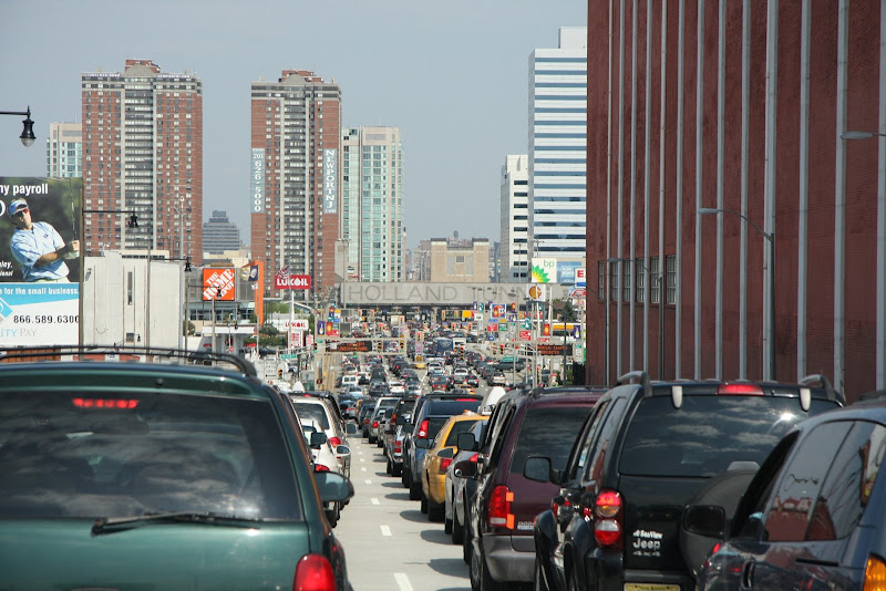 Am Morgen vom 26. Juli gings dann weiter Richtung New York. 100 Meilen trennten uns noch von der grossen Stadt. Je weiter wir fuhren, desto kurviger, breiter und befahrener wurden die Autobahnen. Das ist uns auch schon aufgefallen in der USA: Der Zustand der Strasse (Grösse der Schlaglöcher, Dellen oder Risse) ist umgekehrt proportional zur Grösse der Stadt. Wir waren also gespannt, ob die Stadt besonders schlechte Strassen besitzt. Unser angepeilter Campground lag in New Jersey City. Der Weg dahin wurde tatsächlich recht haarsträubend – da waren so grosse Schlaglöcher wie wir sie noch nie gesehen haben und dabei war die Strasse so eng (mit Autos auf den anderen Spuren), so dass man schlecht ausweichen konnte. Nach weiteren engen Hebebrücken kamen wir schliesslich in New Jersey City an, wo uns die letzte Herausforderung bevorstand: Eine etwa 8-spurige Strasse, die zum Holland Tunnel führte (Verbindungstunnel New Jersey – New York). Die Strasse war überfüllt mit Autos, die alle darauf warteten am Ende der Strasse die Gebühren führen die Durchfahrt des Tunnels zu bezahlen. Wir befanden uns nun auf der Spur ganz Links und uns noch vor dem Tunnel auf die Spur ganz rechts durchkämpfen und vor dem Tunnel rechts abbiegen. Mit viel Blinkereinsatz und Geduld schafften wir auch das und gelangten schlussendlich zu unserem Campground im Marina Hafengebiet. Dieser Camper-Parkplatz (ähnlich wie in Las Vegas) war zwar alles andere als schön und günstig, wir plannten aber auch nicht in den nächsten Tagen viel Zeit im RV zu verbringen (ausser um zu schlafen). Ausserdem sahen wir von unserem Platz aus die Freiheitsstatue!