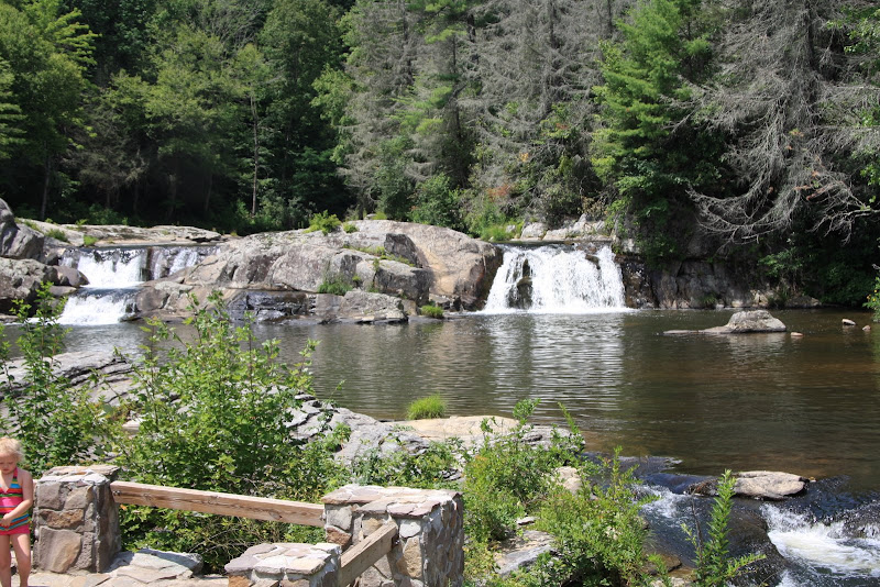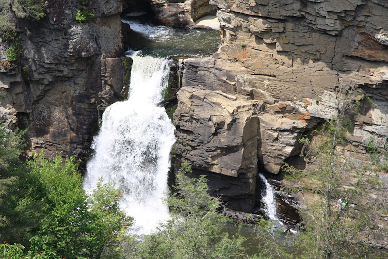 Unterwegs hielten wir auch für eine kleine Wanderung zum Flat Rock, einem Berggipfel benannt nach dem felsigen Untergrund. Auch hier hätte man wunderbares Panorama gehabt, wenn da nicht dieser Dunst in der Luft lag. Weiters gelangten wir zu den Linville Falls. Uns viel schon auf: Hier musste es was grösseres geben, der Parkplatz war ungewöhnlich gefüllt. Nach einer Meile sahen wir die Linville Wasserfälle – zuerst allerdings nur die oberen. Der untere Teil des Flusses verschwand in einer Schlucht. Nach einer weiteren Meile laufen, fanden wir uns auf einer kleinen Terrasse mit einem super Überblick über das Ganze. Nun sahen wir auch den unteren, deutlich grösseren Wasserfall. Dieser Stopp hat sich auf alle Fälle gelohnt!