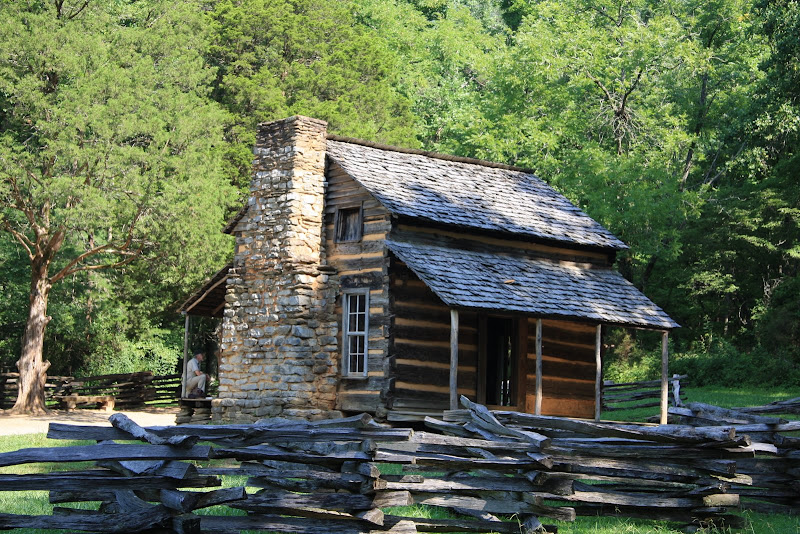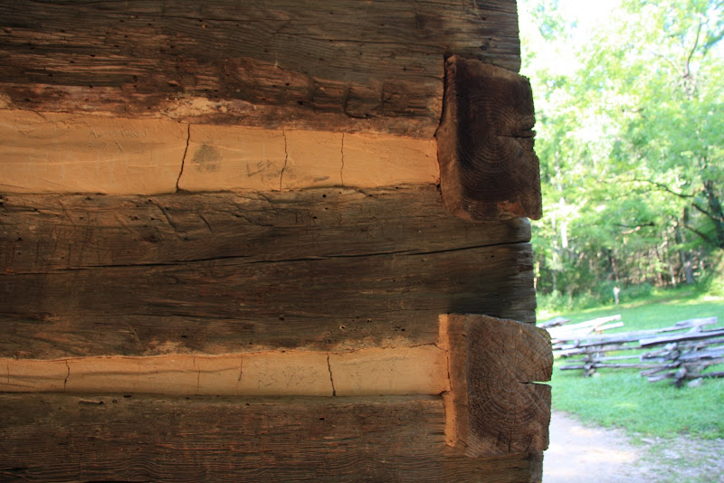 Auch heute (7. August) mussten wir verhältnismässig früh raus. Der Grand Smoky Mountain NP hatte für uns noch zwei Attraktionen bereit. Zum einen war das der Cades Cove Loop, wo man alte Gebäude der Farmer, welche hier im 18. und 19. Jahrhundert gelebt haben, besichtigen konnte. Bis wir aber endlich bei der Loop ankamen war schon halb 11 – die Strasse, welche von unserem Campground in Elkmont zum Loop hoch führte wollte einfach nicht mehr enden und war mit dem Wohnmobil bei Gegenverkehr eine echte Herausforderung. Wir kamen aber ohne Zwischenfall beim Loop an, staunten aber nicht schlecht, als wir nach der zweiten Kurve der One Way Strasse schon im Stau standen… Das kann ja heiter werden, vor allem mit der Parkplatz-Suche bei den jeweiligen Gebäuden! Glücklicherweise fanden wir aber immer einen Parkplatz, die Amis scheinen tatsächlich mehr Freude am Autofahren zu haben als am Wandern! 😉 Erster Halt war beim „John Oliver Place“, dies ist das älteste Holzhaus, gebaut aus ganzen Baumstämmen im Cades Coves. Die Lücken zwischen den Stämmen wurden mit Schlamm gefüllt, dies schützte die Bewohner von Wind, Schnee und Regen.