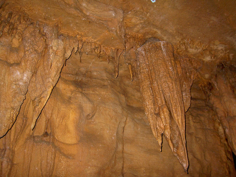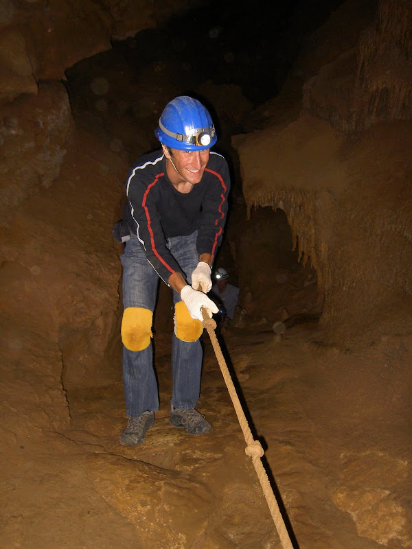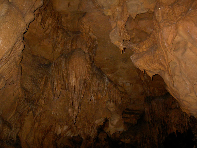 Um 1 Uhr gings dann los, ausgerüstet mit Helm, Licht, Handschuhen und Knieschonern. Im Gegesatz zur Ruby Falls Tour waren wir hier eine Gruppe mit lediglich 11 Leuten, also viieeel angenehmer 😉 Zuerst liefen wir durch die Höhlenräume, die für die 40min Sightseeingtouren beleuchtet und am Boden geebnet sind. Dann aber verliessen wir den zementierten Weg und schlüpften durch ein Loch in der Wand. Bereits ging es los – Kriechen war angesagt! Als nächstes durfte man sich eine steile Rampe am Seil hochziehen. Eine weitere Kriechpassage folgte („muess ich jetzt wörkli mitem Buuch am Bode chrüche?“) und dann eine Holzplanke, über die man balancieren musste. Und so gings weiter, bis wir im Grand Junction Room (übersetzt: Grosse Kreuzung) ankamen. Der Racoon Wild Cave scheint ein sehr verzweigtes Höhlensystem zu sein, denn von diesem Raum aus – man ahnts vom Namen – führen nicht weniger als 19 (neun-zehn) Gänge weg. Nicht dass wir irgend einen Ausgang sofort selber entdeckten, aber Kyle, unser Guide, erklärte das uns. „Dort gehen wir jetzt durch und irgendwo da unten werden wir in zwei Stunden wieder rauskriechen“.