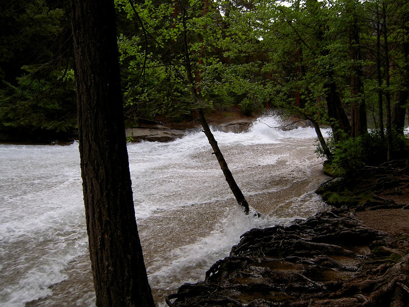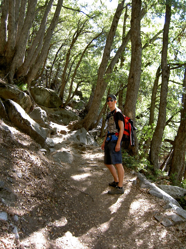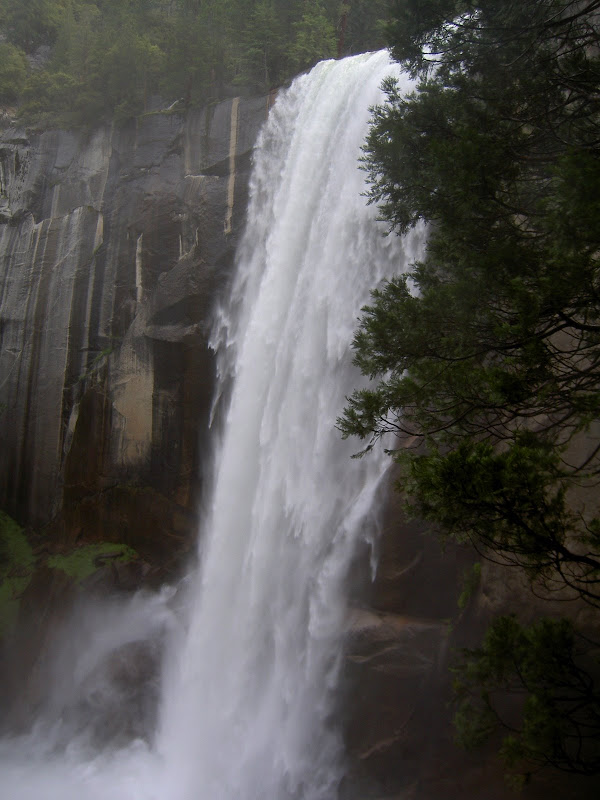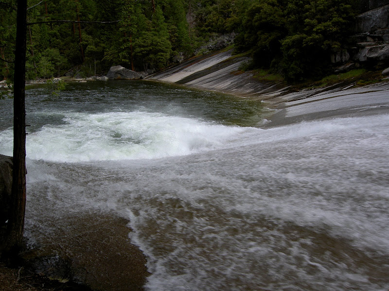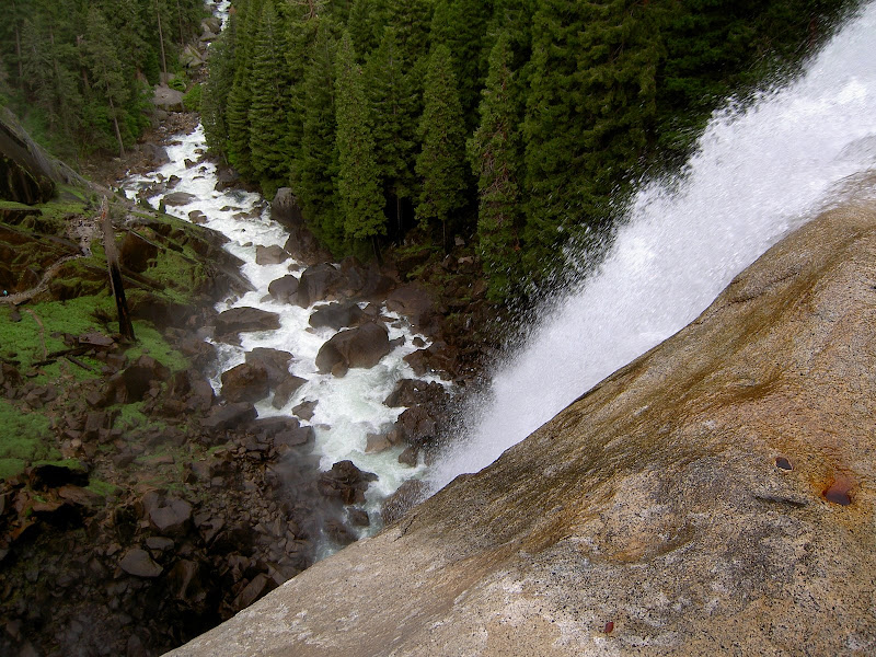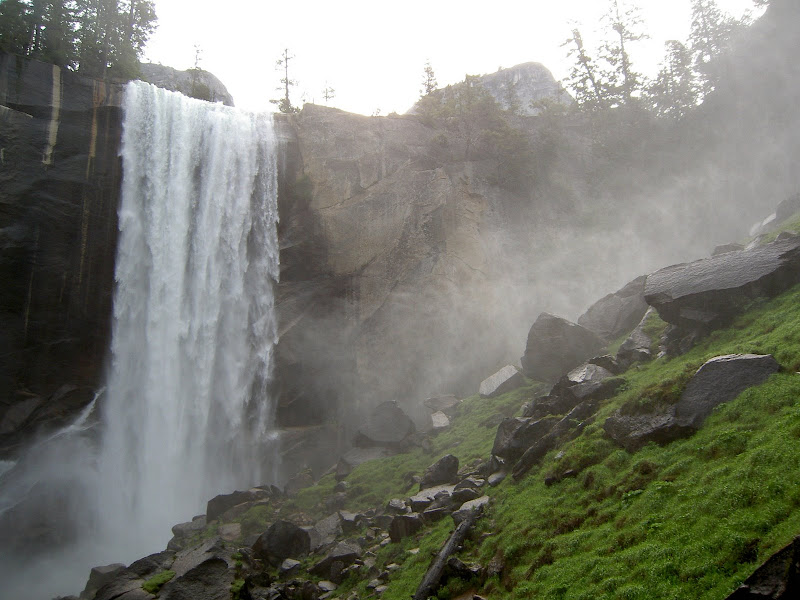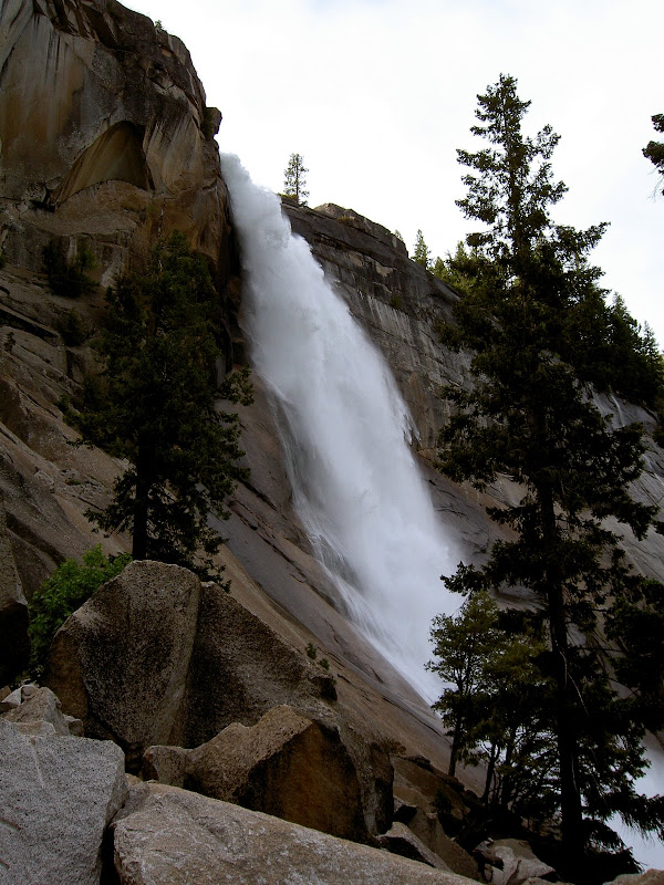 Früh ging es heute (10. Juni 2009) los: Schon um 4 klingelte erbarmungslos der Wecker. Pascal war ausnahmsweise mal zuerst aus dem Bett und freute sich mächtig darüber! Ich brauchte heute etwas länger, aber um 5 Uhr ging es dann gestärkt Richtung Yosemite Valley. Etwas erstaunt waren wir, als das Schild für unser Parkinglot schon um 6 Uhr früh „full“ anzeigte. Wir ignorierten es und fuhren trotzdem auf den Parkplatz –tatsächlich hatte es schon ziemlich viele Autos, wir fanden aber noch ein Plätzchen. Etwas verwirrt waren wir allerding schon: Der Hike auf den Half Dome war laut Visitorguide die schwerste Tageswanderung, was machten also all die vielen Autos schon hier? Wir mussten nicht allzu lange auf die Antwort warten. Auf dem Weg nach oben überholten wir sehr viele Wanderer. Teilweise fragten wir uns, wie die Personen wohl den Weg auf den Dome und dann vor allem wieder hinunter schaffen würden… Zuerst wurden wir aber mit einer kühlen Dusche beschenkt. Schuld daran war der Vernal Fall. Zum Glück ging es die Treppe hoch und somit wurde uns nicht allzu kalt. Es stand aber noch ein weitere Wasserfall auf dem Programm, bevor wir in den Wald und dann später zum Half Dome gelangten: Nevada Fall. Dieser verzichtete darauf, uns erneut zu Duschen und so konnte Pascal in Ruhe ein paar Highspeed Videos machen.