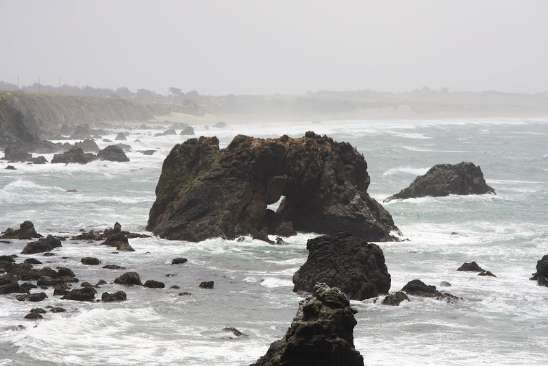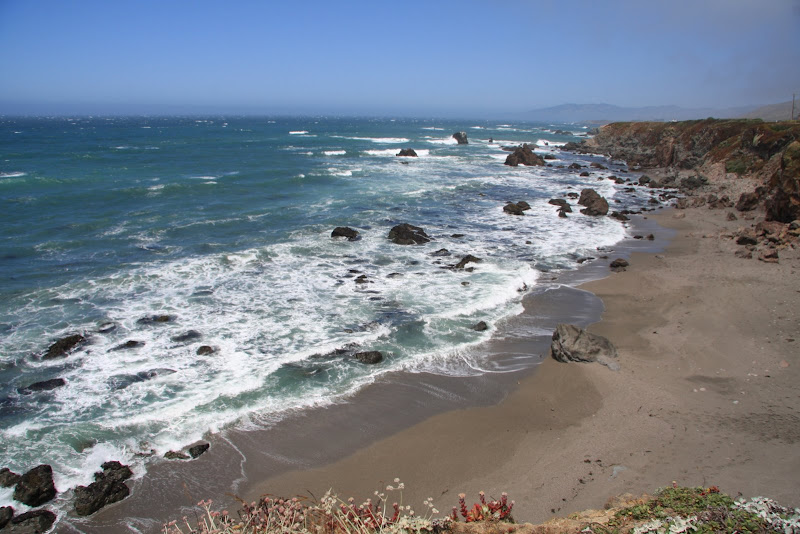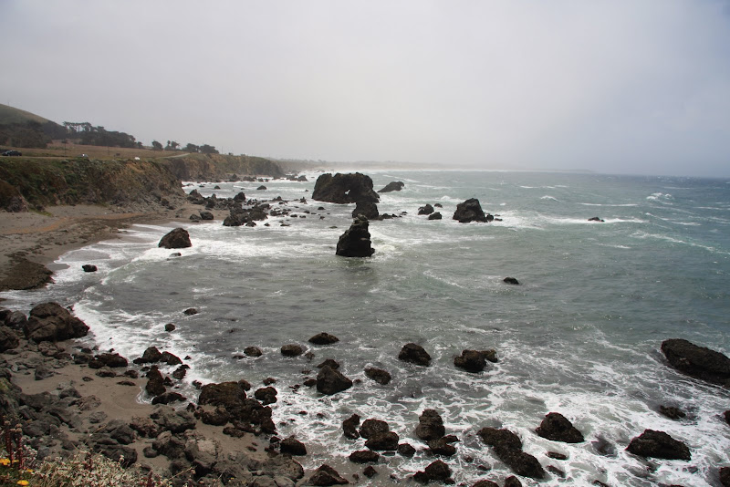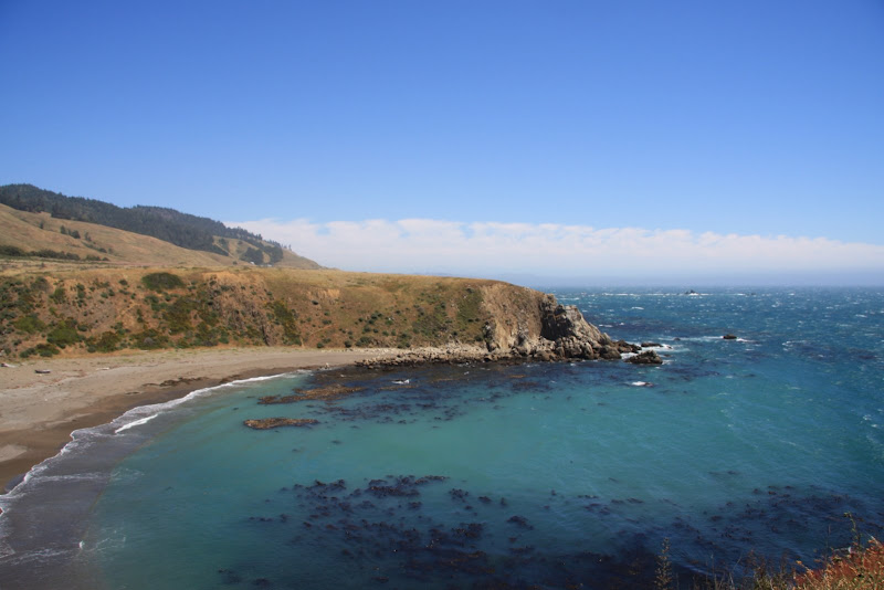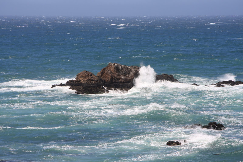 Am Freitag, 19.6 setzen wir unsere Reise Richtung Norden entlang der Küste fort. Unser Triton RV ist in Höchstform – neben Brems- und Beschleunigungsarbeit „rösslet’s“ mit Janine am Steuer um Kurve und Kurve. Und dazu dieser Gegenwind! Kommt da etwa ein Sturm auf? Wir haben jedenfalls unseren Spass dabei immer wieder bei Vistas (Aussichtspunkte) zu stoppen und die Aussicht zu geniessen. Durch den starken Wind ist das Meer extrem unruhig und zischt gegen die felsigen nordkalifornischen Küstenabschnitte.