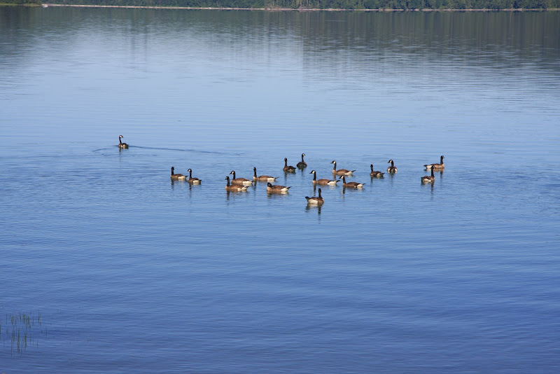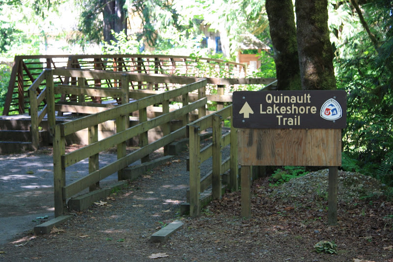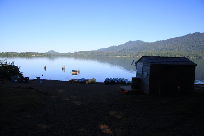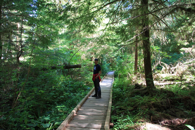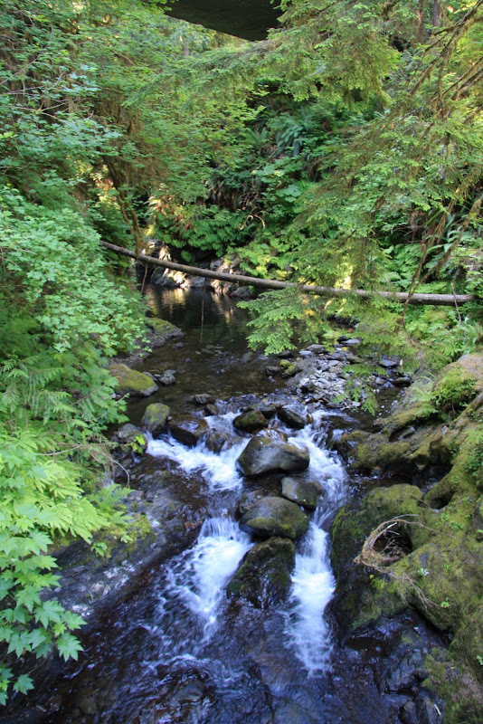 Auf dem Verdauungsspaziergang gestern Abend hatten wir festgestellt, dass unser Campground nur RVs erlaube, welche die Länge von 16 Fuss nicht überschreiten . Wir machten uns am morgen deshalb so bald wie möglich aus dem Staub. Jedoch nicht allzu weit weg, der Parkplatz der Rangerstation war nur ein Steinwurf von unserem Campingplatz entfernt und so starteten wir von dort aus unsere Morgenwanderung. Die erste Meile wanderten wir Richtung Westen dem Seeufer entlang. Anschliessend bog der Weg in den dortigen „Rain Forest“ ab. Rain Forest in Nordamerika heisst: Genügend Niederschlag, viel Farn und noch mehr Moos, welches wie Teppich von den Bäumen hing. In diesem Wald blieben wir bis zum Schluss des Trails, mal mehr oder weniger dicht. Auch kamen wir noch an einem kleinen Wasserfall vorbei, dem „Cascade Falls“, dem seinem Namen alle Ehre machte.
