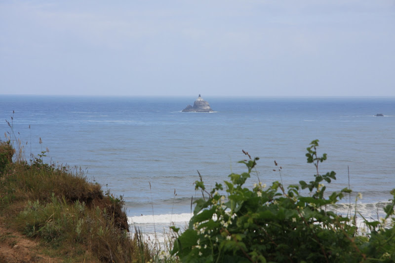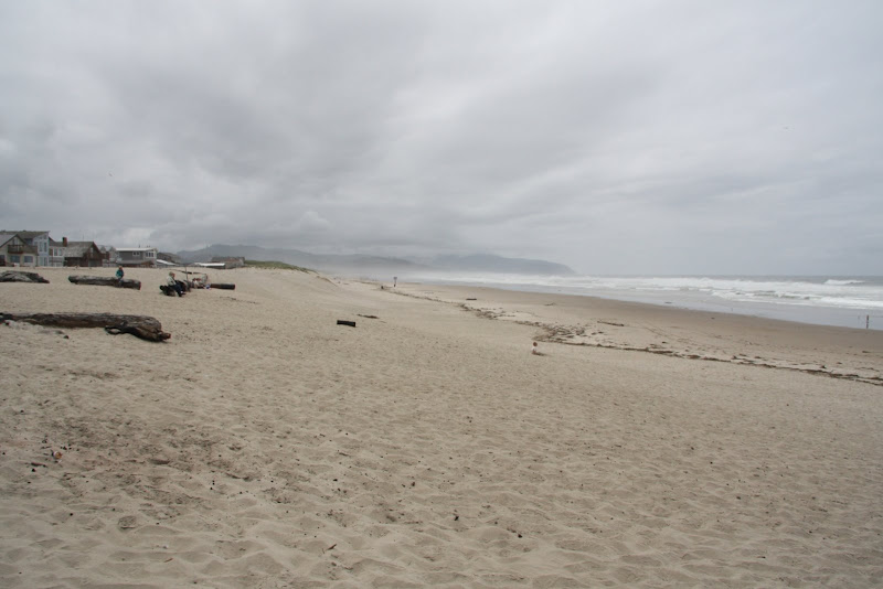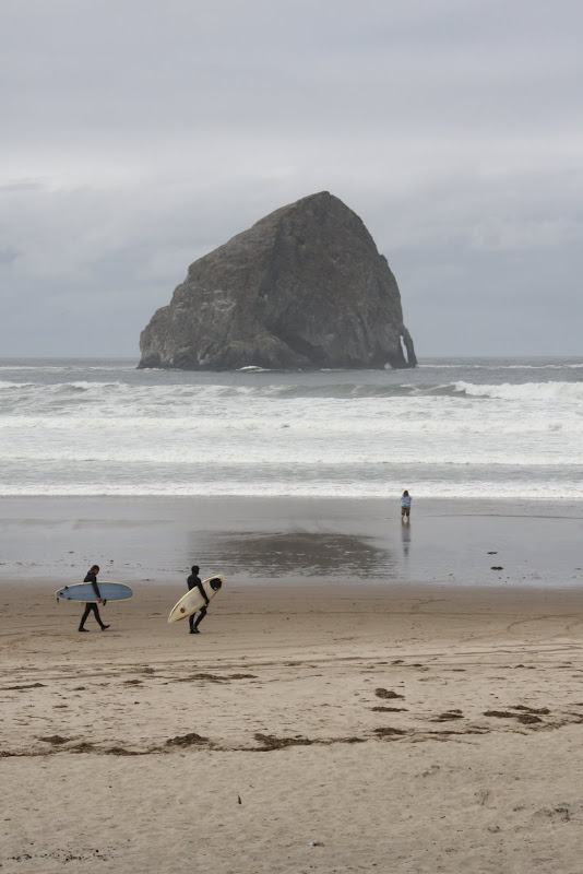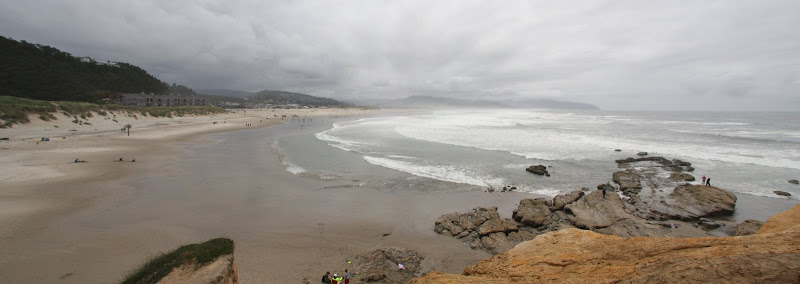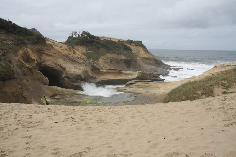 Nach unserem günstigen KOA Camping fuhren wir am 25. Juni entlang des Devils Lake bei Lincoln City wieder auf die 101. Ein paar Meilen weiter nördlich verläuft die 101 ein Zeit lang im Inland, zum Glück gibt es da aber die 3 Capes Scenic Route. Wie der Name schon verrät verläuft diese Strasse der Küste entlang zu 3 Kaps. Unser erster Stopp war beim Haystack Rock am Kiwanda Beach. Wir waren überrascht, wie gross die Wellen hier waren – zwei Surfer versuchten hier auch ihr Glück. Immerhin einer schaffte es nach 30min die Wellen zu durchschwimmen um dann aufs Brett zu steigen und sich in kurzer Zeit wieder an den Strand gleiten zu lassen. Nördlich des Strandes befindet sich ein hoher Sandhügel, auf dem fleissig geboardet wurde – aber auch das scheint nicht so ganz so zu funktionieren wie wir das vom Snowboarden gewöhnt sind. Die Küste besteht hier grösstenteils aus Sandstein und wurde im Laufe der Zeit entsprechend geformt vom Meer.