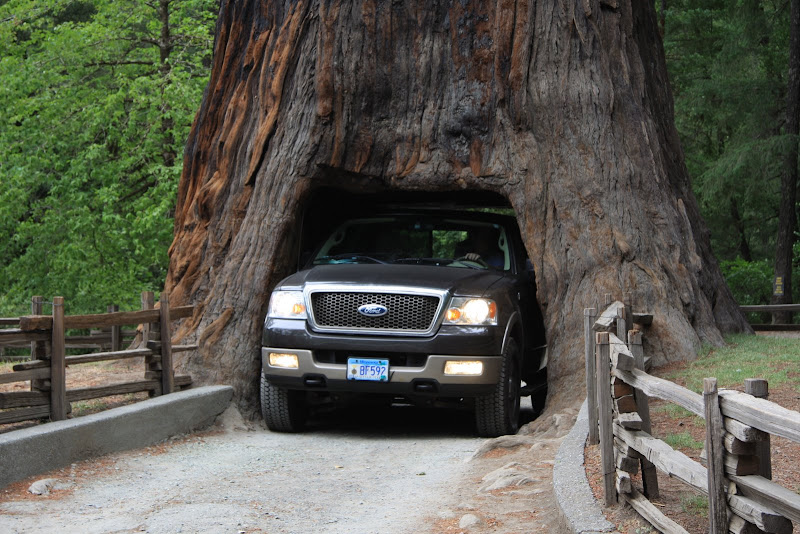 Giant Sequoias bestaunten wir bereits im Yosemite National Park in Mariposa Grove. Was uns nun erwartete, sind Redwoods – die dünneren, aber höheren Verwandten eben dieser Giant Sequoias. Zuerst galt es aber den Durst des Motorhomes zu stillen. In Fort Bragg fanden wir eine relativ günstige Tankstelle für 2.91$ pro Gallone. Im restlichen Gebiet treiben sich die Preise so auf 3.15$ (in LA war der Sprit für herrliche 2.40$ zu haben) – so oder so knackt nun unser Triton die 100$ Grenze für einen vollen Tank. Nach Rockport schlängelt sich der Highway 1 in schweizerischer Art von der Küste weg durch Wald und Hügel. Nach einigen Meilen trafen wir in Legget ein, hier befindet sich eine weltberühmte Sehenswürdigkeit: Der Chandelier Drive Thru Tree. Anhand der folgenden Photoshopstudie erkennt man, dass wir da nicht durchpassten. Witzig war es aber den SUV’s zuzuschauen, die sich da knapp durch das Loch zwängten.