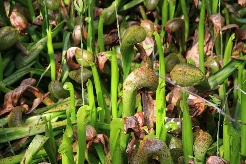 Am Morgen des 24. Juni sah es um das Wetter nicht mehr so gut aus wie am Tag davor, es war bewölkt. Nach dem Morgenessen erkundeten wir einen Trail, der gleich vor unserem Campingplatz begann. Entlang dieses Weges sollen carnivore (fleischfressende) Pflanzen wachsen. Während den rund 50m konnten wir die angegebene Pflanzenart jedoch nicht finden und kehrten zum Motorhome zurück. Nach der ersten Meile bot sich einen zweiten, ähnlichen Trail an. Uns nahm es noch immer wunder, wie die Pflanze aussehen würde und parkierten hier. Und tatsächlich hatten wir hier mehr „Glück“. Da gab es eine ganze Lichtung vollbewachsen mit dieser Pflanze (den Namen haben wir leider vergessen). Diese Pflänzchen haben sich auf Insekten spezialisiert. Diese werden mit Gerüchen und Farben in eine kleine Öffnung gelockt. Sobald sie sich in der ersten Kammer befinden, werden sie durch transparente Wände, welche sie für Ausgänge halten, verwirrt. Früher oder später geraten sie dabei in den Stiel der Pflanze, wo viele spitzige, nach unten gerichtete Härchen dafür sorgen, dass das Insekt nach unten in eine Flüssigkeit fällt. In dieser enzymhaltigen Flüssigkeit werden die Tiere dann „verdaut“.