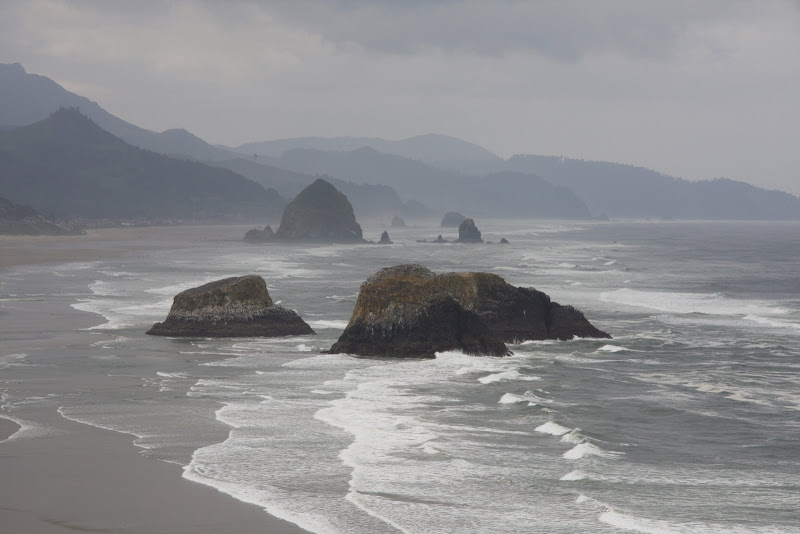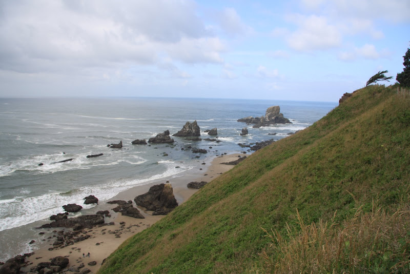 Unser Campground lag in der Nähe des Cannon Beach mit dem berühmten Haystack Rock. Gesehen hatten wir das ganze allerdings noch nicht. So fuhren wir am Morgen des 26. Juni zum Ecola State Park, welcher eine schöne Aussicht auf den ganzen Strand ermöglichen soll. Die Zufahrtsstrasse war recht eng, kurvig und zum Teil mit kleinen „Schanzen“ versehen, doch Janine meisterte auch diese Fahrt mit Bravour. Für die vielen State Parks an der Oregon Küste müsste man jeweils 3-5$ bezahlen, doch günstiger fährt man, wenn man beispielsweise einen 5 Tagespass für die State Parks an der Oregan Küste in einem Visitor Center für 10$ kauft. Das hat sich für uns vor allem deswegen ausgezahlt, da wir meist nur für einen kurzen Besuch in diese State Parks fahren. Die Fotos vom Ecola State Park wurden wirklich cool, man sieht auch, dass sich das Meer wieder langsam vom Strand zurückzieht – die Flut (High tide) von gestern zieht sich zurück.