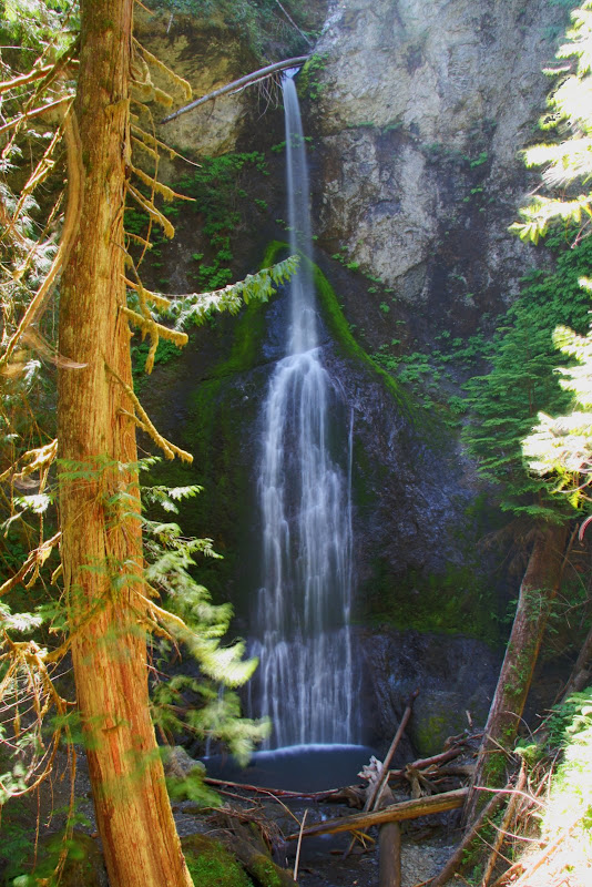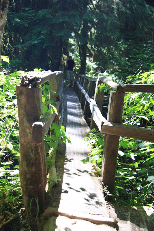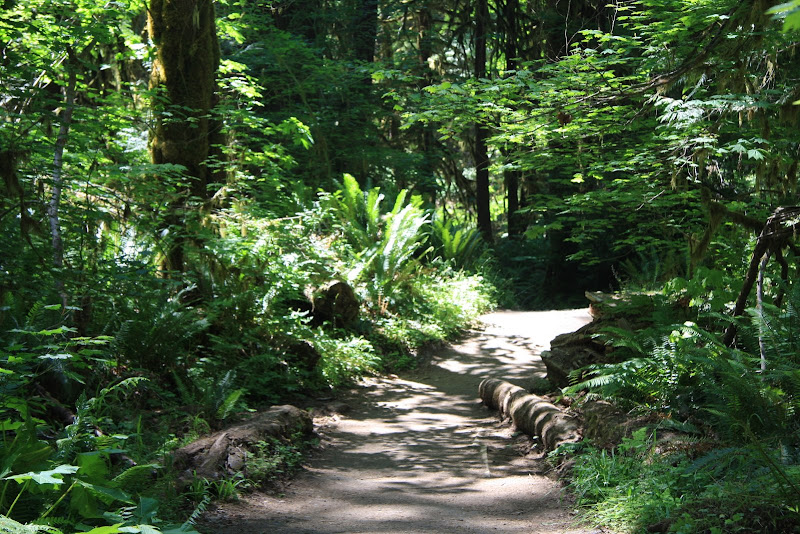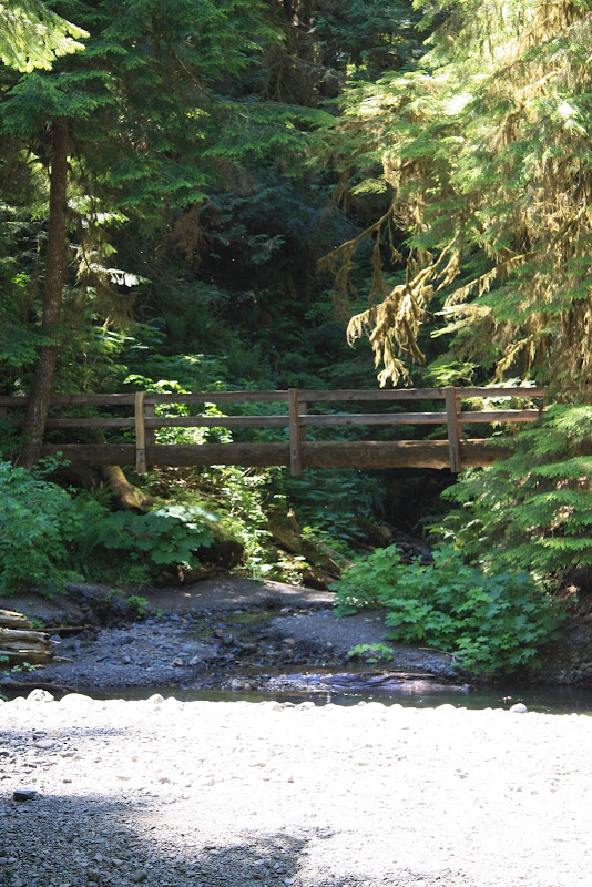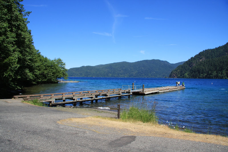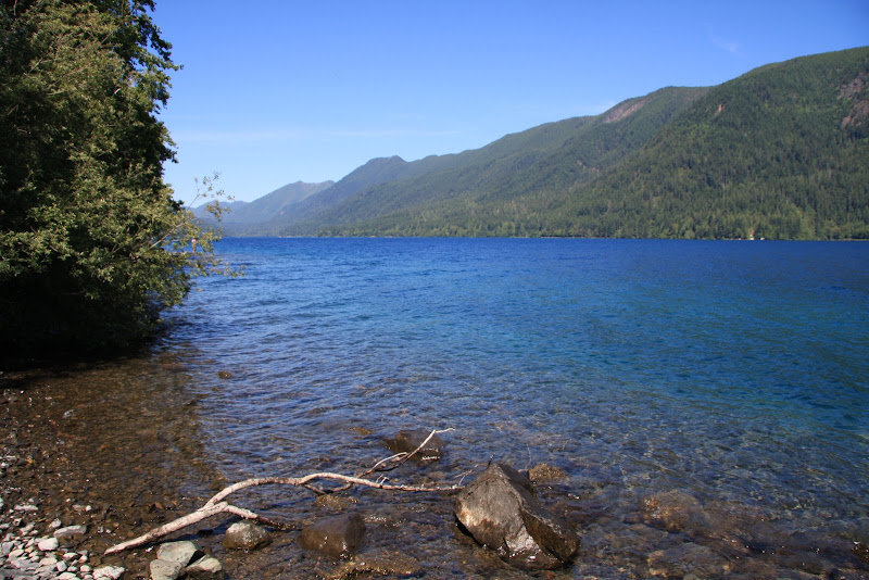 Wir verbrachten einen weiteren Tag (2. Juli 09) damit, den „Olympic National Park“ zu entdecken. Zuerst mussten wir aber die 19 Meilen zurück zum 101 fahren. Der 101 führte uns durch Forks, die Stadt, in der Teile des Films Twilight gedreht wurden, bis an den „Lake Crescent“, wo der Highway anschliessend dem Ufer folgte. Wir hielten bei der „Strom King Information Station“, die sich etwa auf halber Strecke des Weges um das Seeufer befand. Von dort aus wanderten wir zum „Marymere Fall“ und diesmal wurden wir nicht enttäuscht, dies war tatsächlich ein Wasserfall – wenn auch mit nicht allzu viel Wasser! Auf dem Rückweg hielten wir am Seeufer. Dieser See, mit einer Tiefe von 600 Fuss, war wirklich tiefblau und so beobachteten wir das tolle Farbspiel etwas, bevor wir wieder mit unserem Triton weiterfuhren.